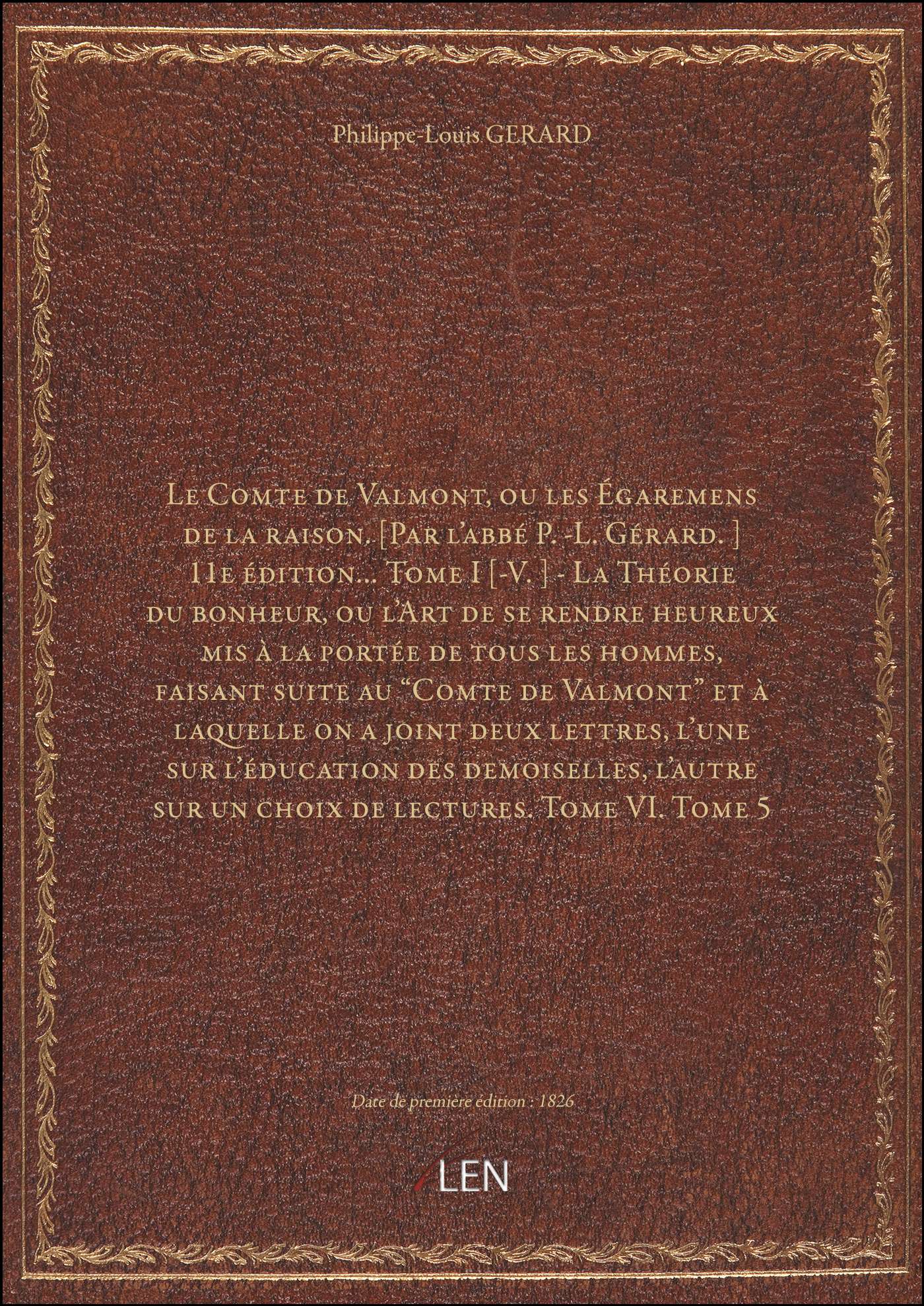 Titre complet : Le Comte de Valmont, ou les Égaremens de la raison. [Par l'abbé P.-L. Gérard.] 11e édition... Tome I [-V.] - La Théorie du bonheur, ou l'Art de se rendre heureux mis à la portée de tous les hommes, faisant suite au "Comte de Valmont" et à laquelle on a joint deux lettres, l'une sur l'éducation des demoiselles, l'autre sur un choix de lectures. Tome VI. Tome 5