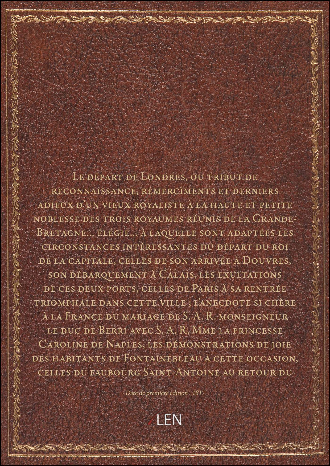 Titre complet : Le départ de Londres, ou tribut de reconnaissance, remercîments et derniers adieux d'un vieux royaliste à la haute et petite noblesse des trois royaumes réunis de la Grande-Bretagne... élégie... à laquelle sont adaptées les circonstances intéressantes du départ du roi de la capitale, celles de son arrivée à Douvres, son débarquement à Calais, les exultations de ces deux ports, celles de Paris à sa rentrée triomphale dans cette ville ; l'anecdote si chère à la France du mariage de S. A. R. monseigneur le duc de Berri avec S. A. R. Mme la princesse Caroline de Naples, les démonstrations de joie des habitants de Fontainebleau à cette occasion, celles du faubourg Saint-Antoine au retour du roi au palais des Tuileries, etc., etc...