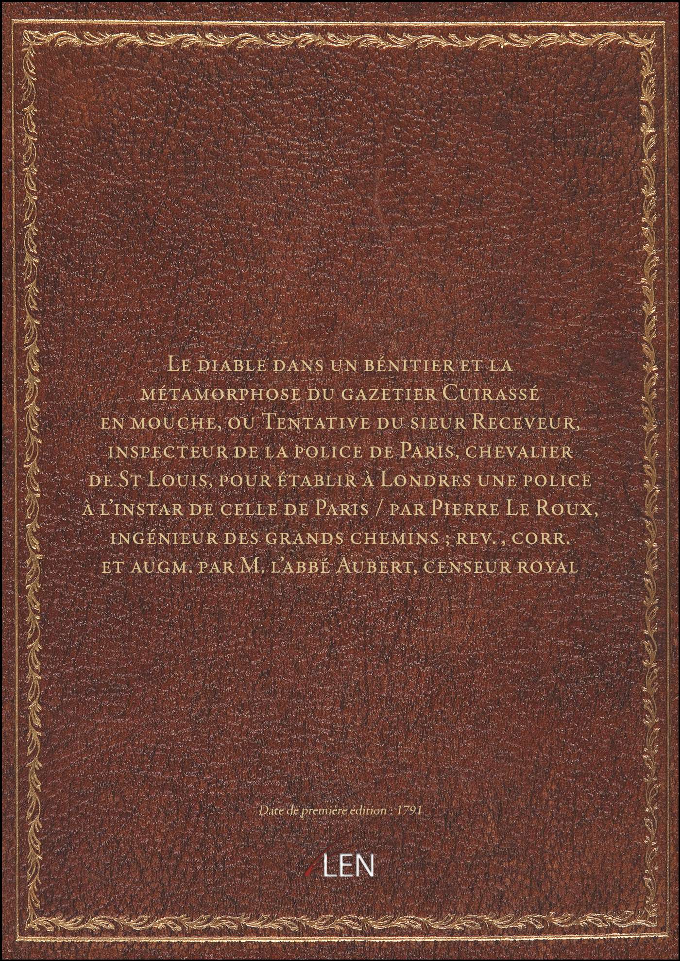 Titre complet : Le diable dans un bénitier et la métamorphose du gazetier Cuirassé en mouche, ou Tentative du sieur Receveur, inspecteur de la police de Paris, chevalier de St Louis, pour établir à Londres une police à l'instar de celle de Paris / par Pierre Le Roux, ingénieur des grands chemins ; rev., corr. et augm. par M. l'abbé Aubert, censeur royal