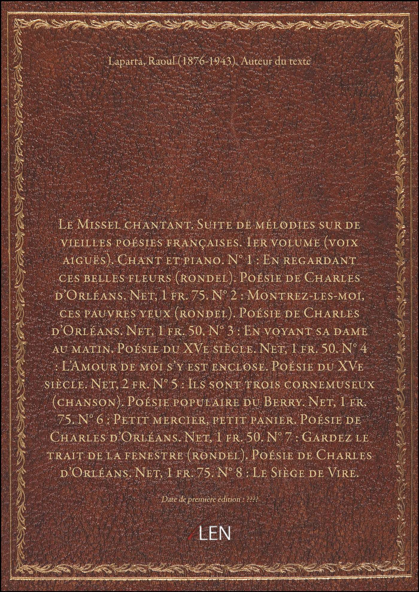 Titre complet : Le Missel chantant. Suite de mélodies sur de vieilles poésies françaises. 1er volume (voix aiguës). Chant et piano. N° 1 : En regardant ces belles fleurs (rondel). Poésie de Charles d'Orléans. Net, 1 fr. 75. N° 2 : Montrez-les-moi, ces pauvres yeux (rondel). Poésie de Charles d'Orléans. Net, 1 fr. 50. N° 3 : En voyant sa dame au matin. Poésie du XVe siècle. Net, 1 fr. 50. N° 4 : L'Amour de moi s'y est enclose. Poésie du XVe siècle. Net, 2 fr. N° 5 : Ils sont trois cornemuseux (chanson). Poésie populaire du Berry. Net, 1 fr. 75. N° 6 : Petit mercier, petit panier. Poésie de Charles d'Orléans. Net, 1 fr. 50. N° 7 : Gardez le trait de la fenestre (rondel). Poésie de Charles d'Orléans. Net, 1 fr. 75. N° 8 : Le Siège de Vire. Poésie de Olivier Basselin. Net, 2 fr. N° 9 : Dieu, qu'il la fait bon regarder ! (rondel). Poésie de Charles d'Orléans. Net, 1 fr. 50. N° 10 : Quand je fus pris au pavillon (rondel). Poésie de Charles d'Orléans. Net, 1 fr. 75. N° 11 : Comment se peut-il faire ainsi ? (rondel) Poésie de Charles d'Orléans. Net, 1 fr. 50. N° 12 : Les moulins moulant. Chanson populaire du Languedoc. Net, 2. fr. 50. Numéro 12