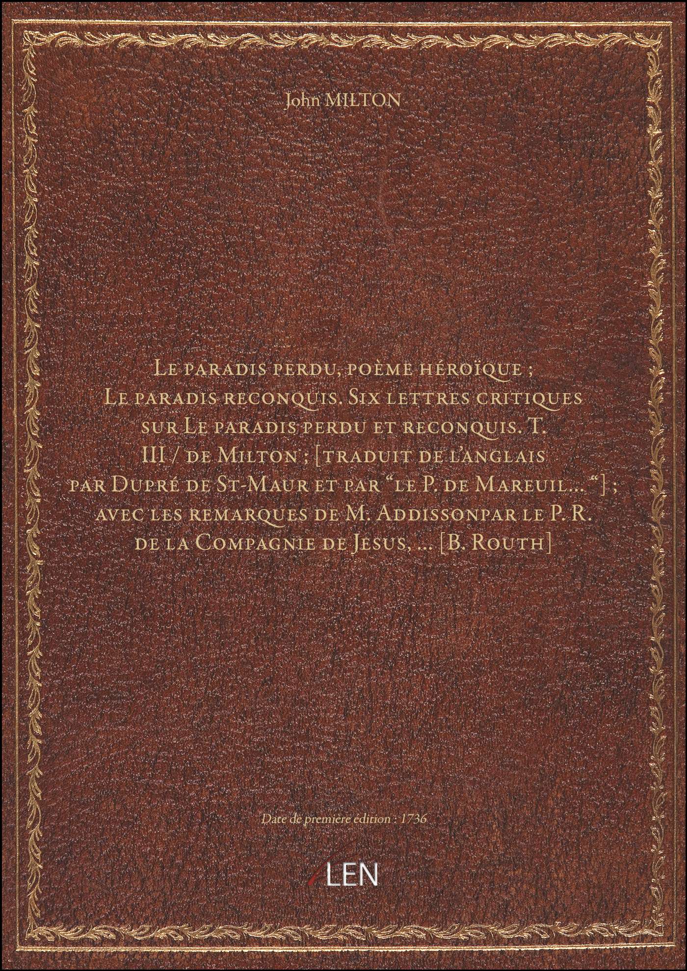 Titre complet : Le paradis perdu, poème héroïque ; Le paradis reconquis. Six lettres critiques sur Le paradis perdu et reconquis. T. III / de Milton ; [traduit de l'anglais par Dupré de St-Maur et par "le P. de Mareuil..."] ; avec les remarques de M. Addissonpar le P. R. de la Compagnie de Jesus,... [B. Routh]
