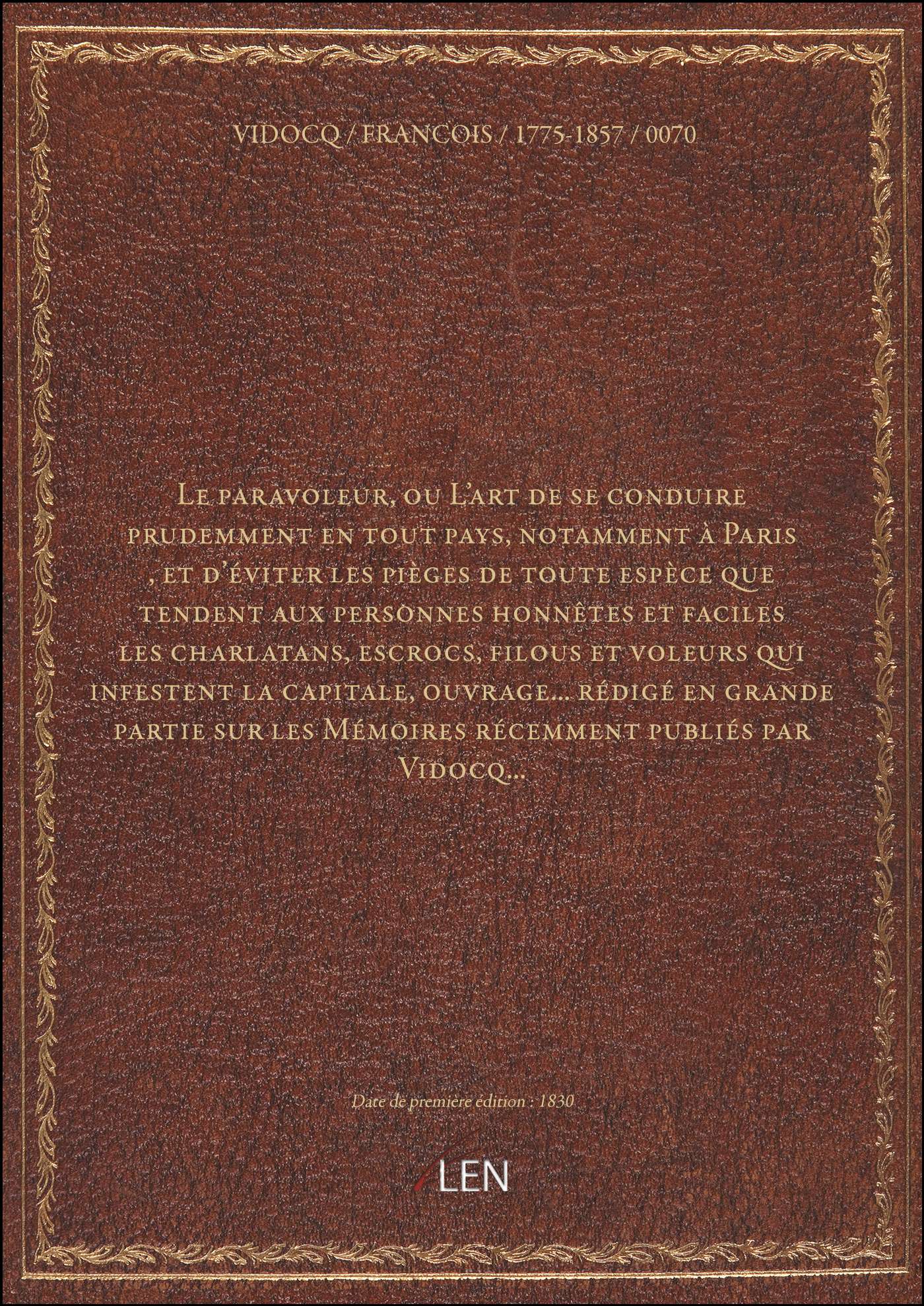 Titre complet : Le paravoleur, ou L'art de se conduire prudemment en tout pays, notamment à Paris , et d'éviter les pièges de toute espèce que tendent aux personnes honnêtes et faciles les charlatans, escrocs, filous et voleurs qui infestent la capitale, ouvrage... rédigé en grande partie sur les Mémoires récemment publiés par Vidocq...