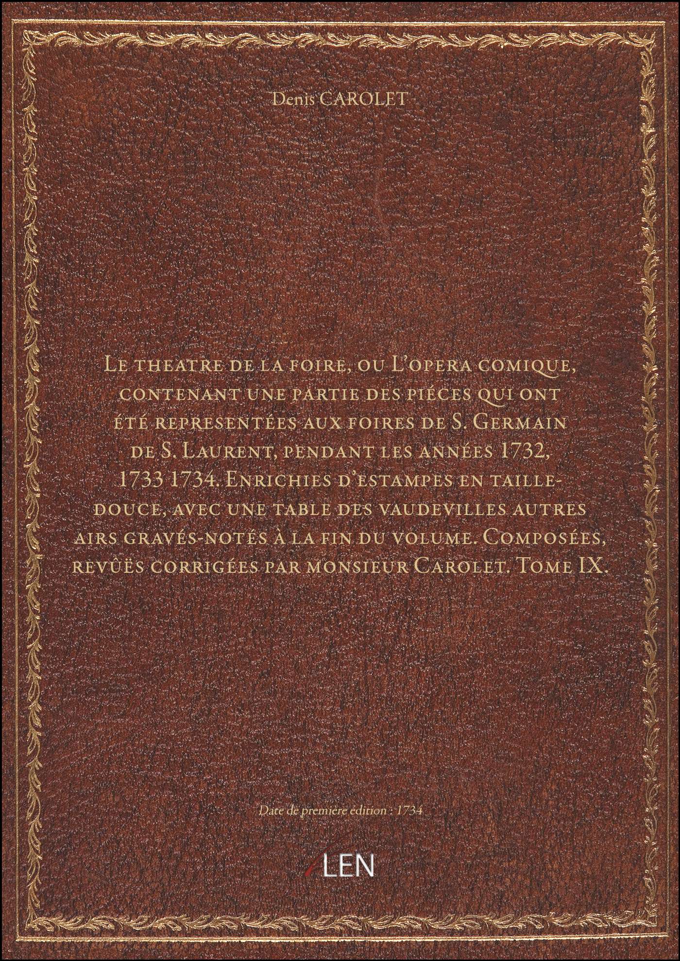 Titre complet : Le theatre de la foire, ou L'opera comique , contenant une partie des piéces qui ont été representées aux foires de S. Germain de S. Laurent, pendant les années 1732, 1733 1734. Enrichies d'estampes en taille-douce, avec une table des vaudevilles autres airs gravés-notés à la fin du volume. Composées, revûës corrigées par monsieur Carolet. Tome IX.