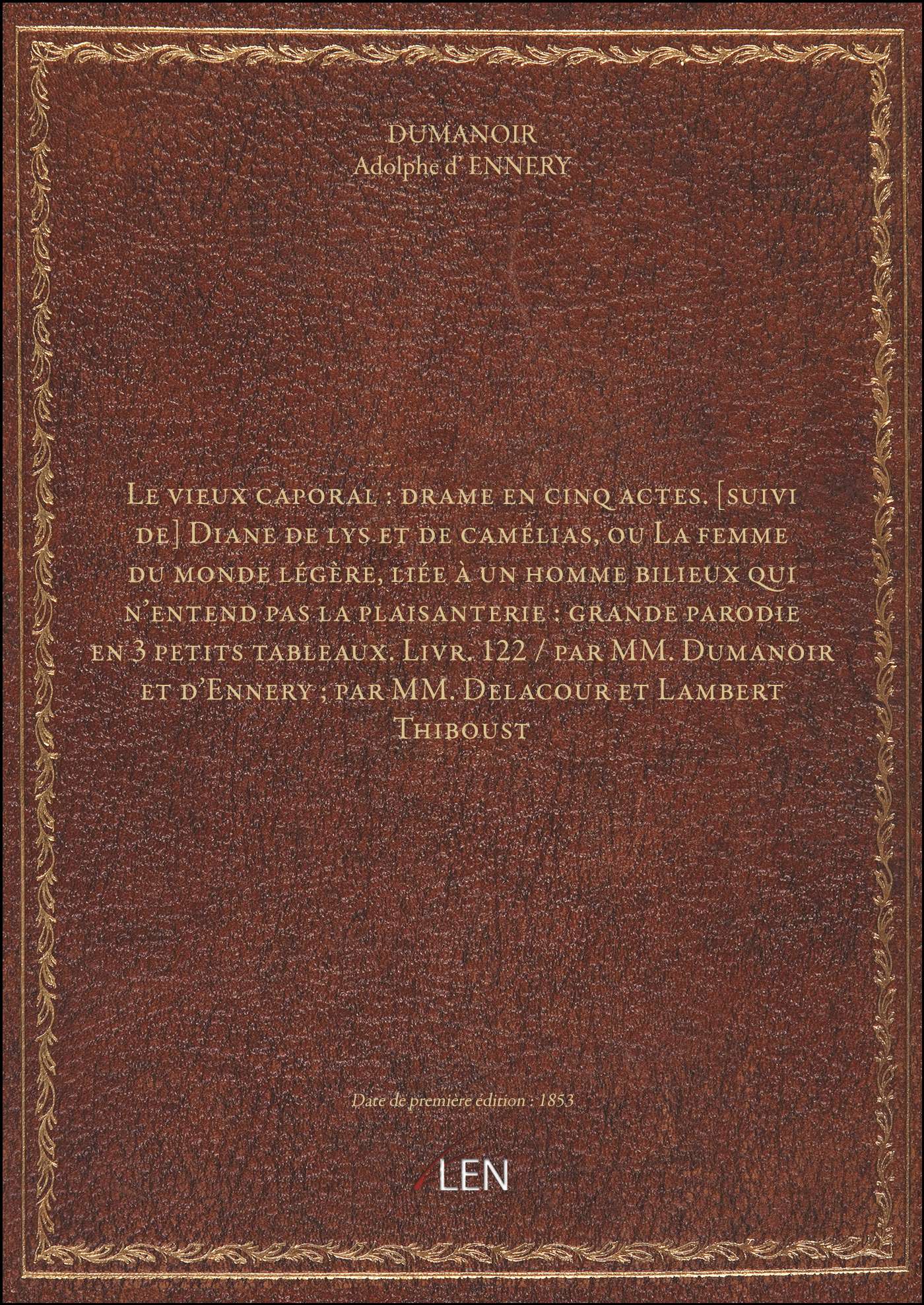 Titre complet : Le vieux caporal : drame en cinq actes. [suivi de] Diane de lys et de camélias, ou La femme du monde légère, liée à un homme bilieux qui n'entend pas la plaisanterie : grande parodie en 3 petits tableaux. Livr. 122 / par MM. Dumanoir et d'Ennery ; par MM. Delacour et Lambert Thiboust