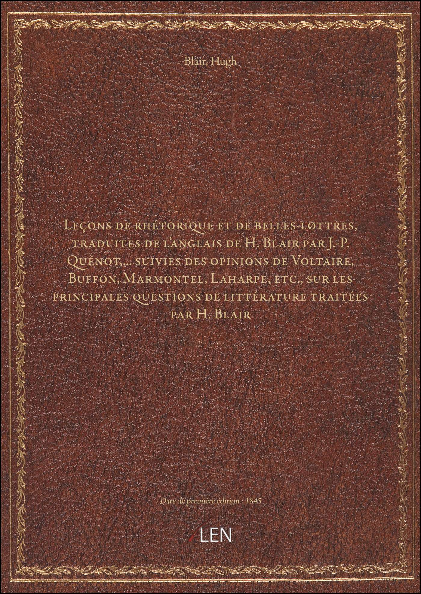 Titre complet : Leçons de rhétorique et de belles-løttres, traduites de l'anglais de H. Blair par J.-P. Quénot,... suivies des opinions de Voltaire, Buffon, Marmontel, Laharpe, etc., sur les principales questions de littérature traitées par H. Blair