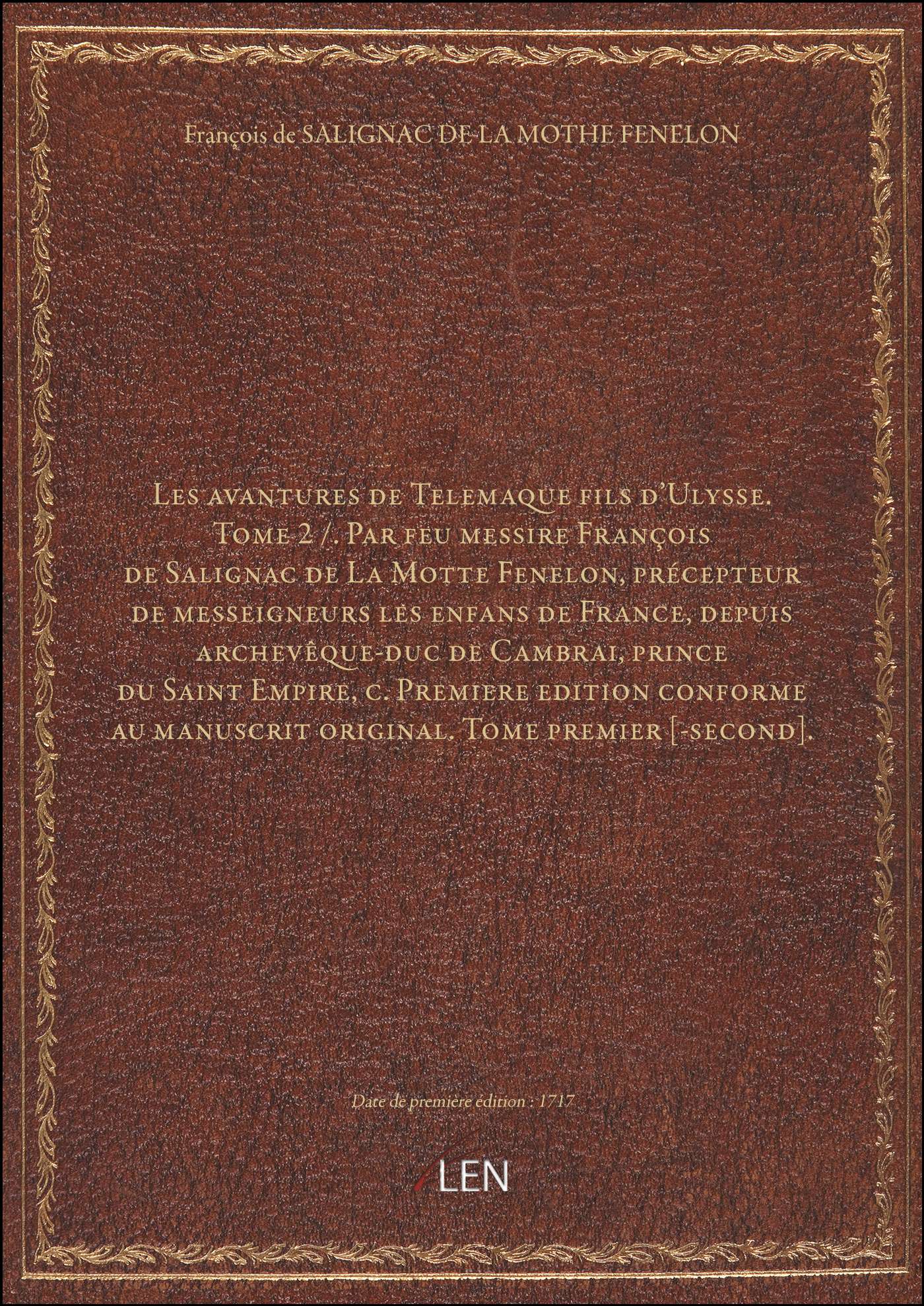Titre complet : Les avantures de Telemaque fils d'Ulysse. Tome 2 / . Par feu messire François de Salignac de La Motte Fenelon, précepteur de messeigneurs les enfans de France, depuis archevêque-duc de Cambrai, prince du Saint Empire, c. Premiere edition conforme au manuscrit original. Tome premier [-second].