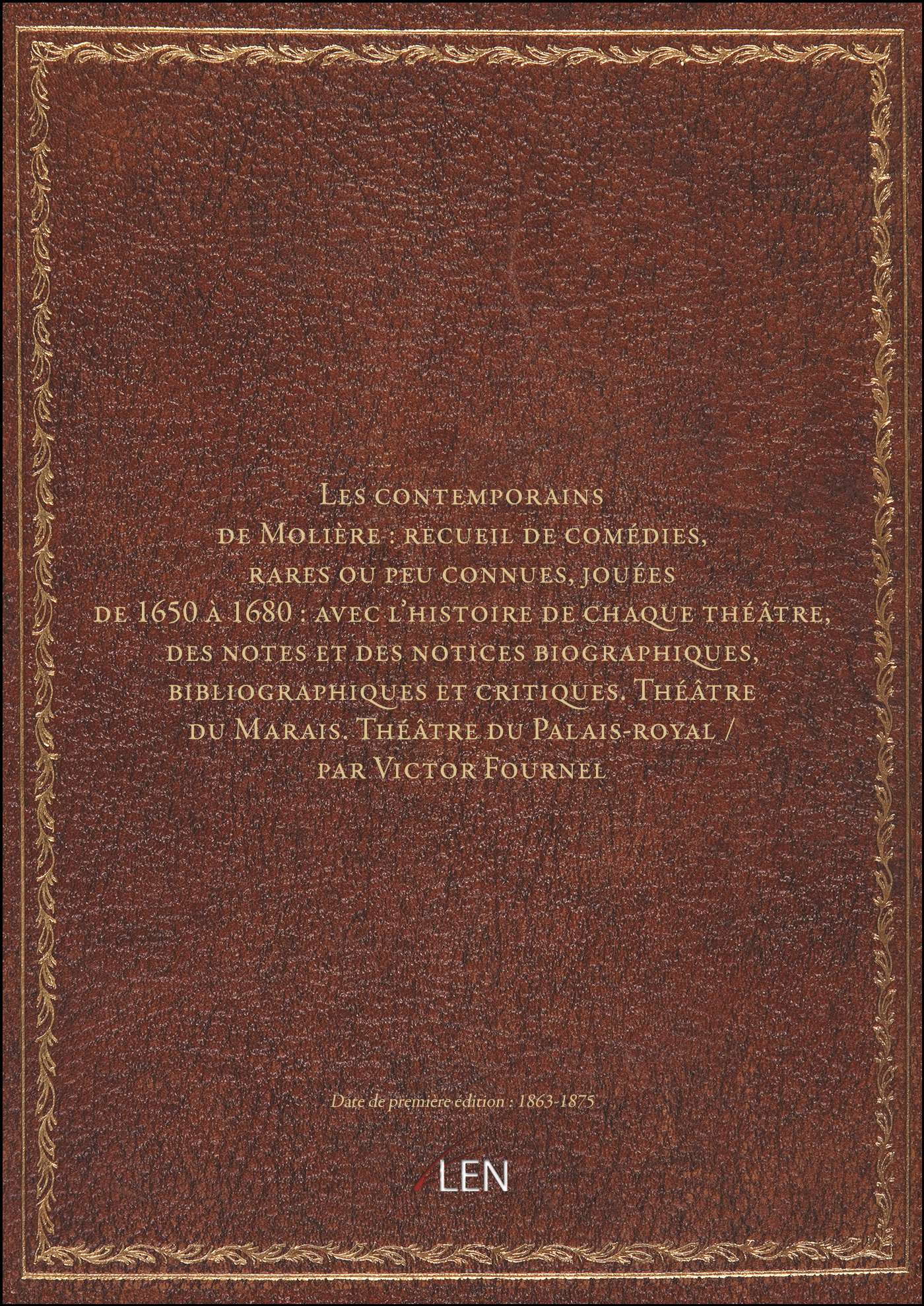 Titre complet : Les contemporains de Molière : recueil de comédies, rares ou peu connues, jouées de 1650 à 1680 : avec l'histoire de chaque théâtre, des notes et des notices biographiques, bibliographiques et critiques. Théâtre du Marais. Théâtre du Palais-royal / par Victor Fournel