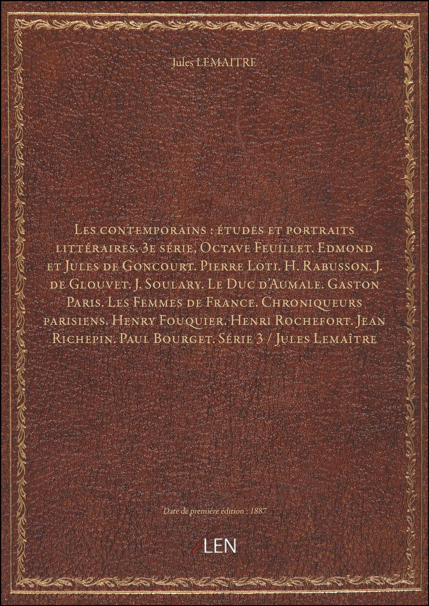 Titre complet : Les contemporains : études et portraits littéraires. 3e série, Octave Feuillet. Edmond et Jules de Goncourt. Pierre Loti. H. Rabusson. J. de Glouvet. J. Soulary. Le Duc d'Aumale. Gaston Paris. Les Femmes de France. Chroniqueurs parisiens. Henry Fouquier. Henri Rochefort. Jean Richepin. Paul Bourget. Série 3 / Jules Lemaître