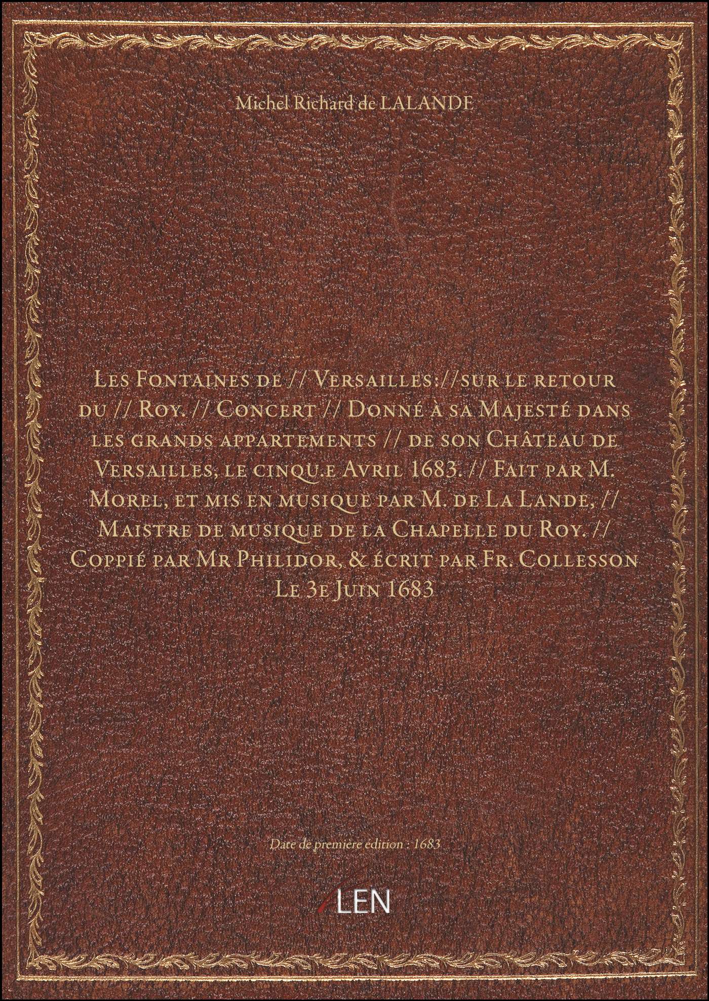 Titre complet : Les Fontaines de // Versailles://sur le retour du // Roy. // Concert // Donné à sa Majesté dans les grands appartements // de son Château de Versailles, le cinqu.e Avril 1683. // Fait par M. Morel, et mis en musique par M. de La Lande, // Maistre de musique de la Chapelle du Roy. // Coppié par Mr Philidor, & écrit par Fr. Collesson Le 3e Juin 1683