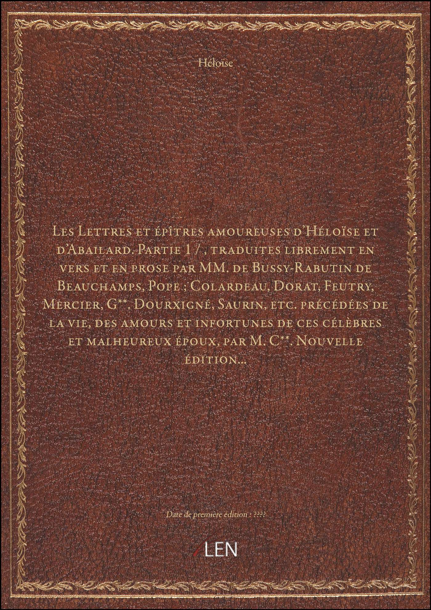 Titre complet : Les Lettres et épîtres amoureuses d'Héloïse et d'Abailard. Partie 1 / , traduites librement en vers et en prose par MM. de Bussy-Rabutin de Beauchamps, Pope ; Colardeau, Dorat, Feutry, Mercier, G**. Dourxigné, Saurin, etc. précédées de la vie, des amours et infortunes de ces célèbres et malheureux époux, par M. C**. Nouvelle édition...