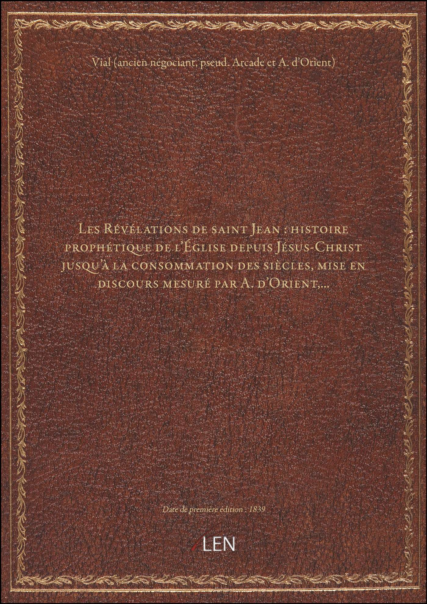 Titre complet : Les Révélations de saint Jean : histoire prophétique de l'Église depuis Jésus-Christ jusqu'à la consommation des siècles, mise en discours mesuré par A. d'Orient,...