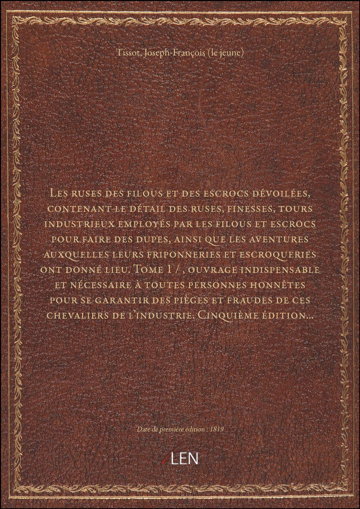 Titre complet : Les ruses des filous et des escrocs dévoilées, contenant le détail des ruses, finesses, tours industrieux employés par les filous et escrocs pour faire des dupes, ainsi que les aventures auxquelles leurs friponneries et escroqueries ont donné lieu. Tome 1 / , ouvrage indispensable et nécessaire à toutes personnes honnêtes pour se garantir des pièges et fraudes de ces chevaliers de l'industrie. Cinquième édition...