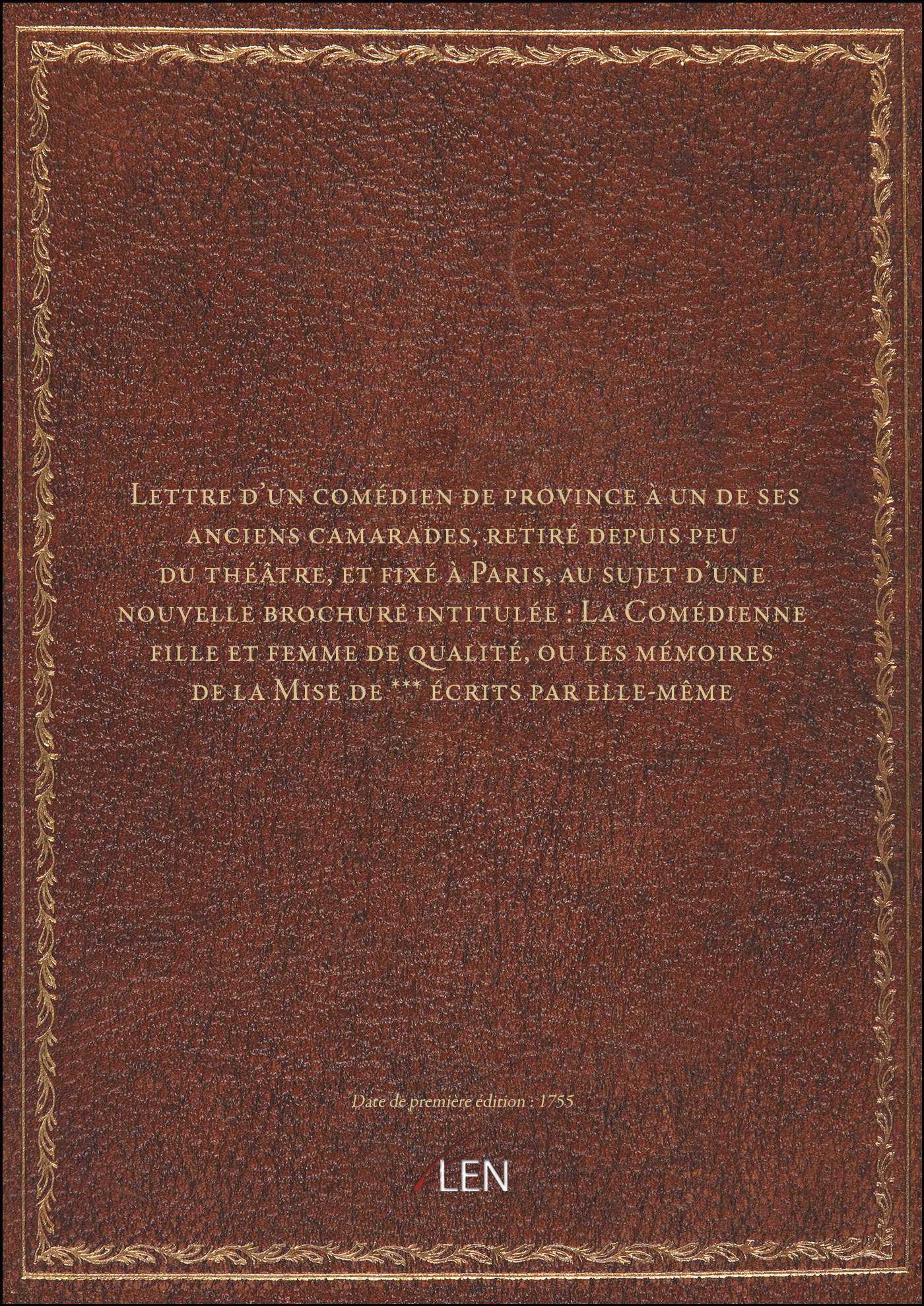 Titre complet : Lettre d'un comédien de province à un de ses anciens camarades, retiré depuis peu du théâtre, et fixé à Paris, au sujet d'une nouvelle brochure intitulée : La Comédienne fille et femme de qualité, ou les mémoires de la Mise de *** écrits par elle-même