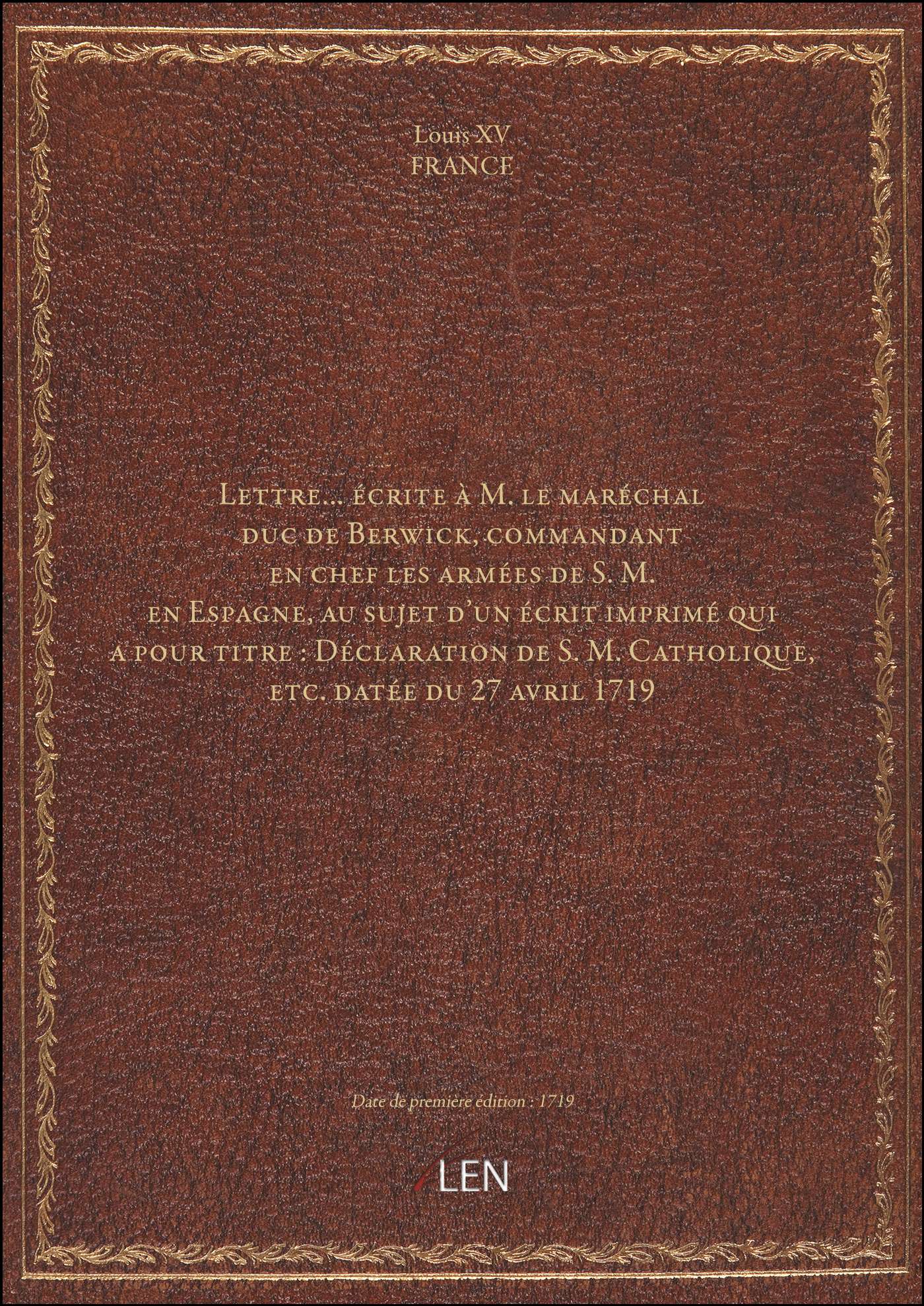 Titre complet : Lettre... écrite à M. le maréchal duc de Berwick, commandant en chef les armées de S. M. en Espagne, au sujet d'un écrit imprimé qui a pour titre : Déclaration de S. M. Catholique, etc. datée du 27 avril 1719