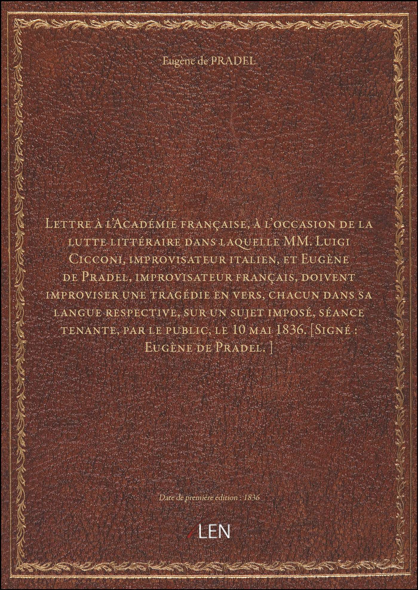 Titre complet : Lettre à l'Académie française, à l'occasion de la lutte littéraire dans laquelle MM. Luigi Cicconi, improvisateur italien, et Eugène de Pradel, improvisateur français, doivent improviser une tragédie en vers, chacun dans sa langue respective, sur un sujet imposé, séance tenante, par le public, le 10 mai 1836. [Signé : Eugène de Pradel.]