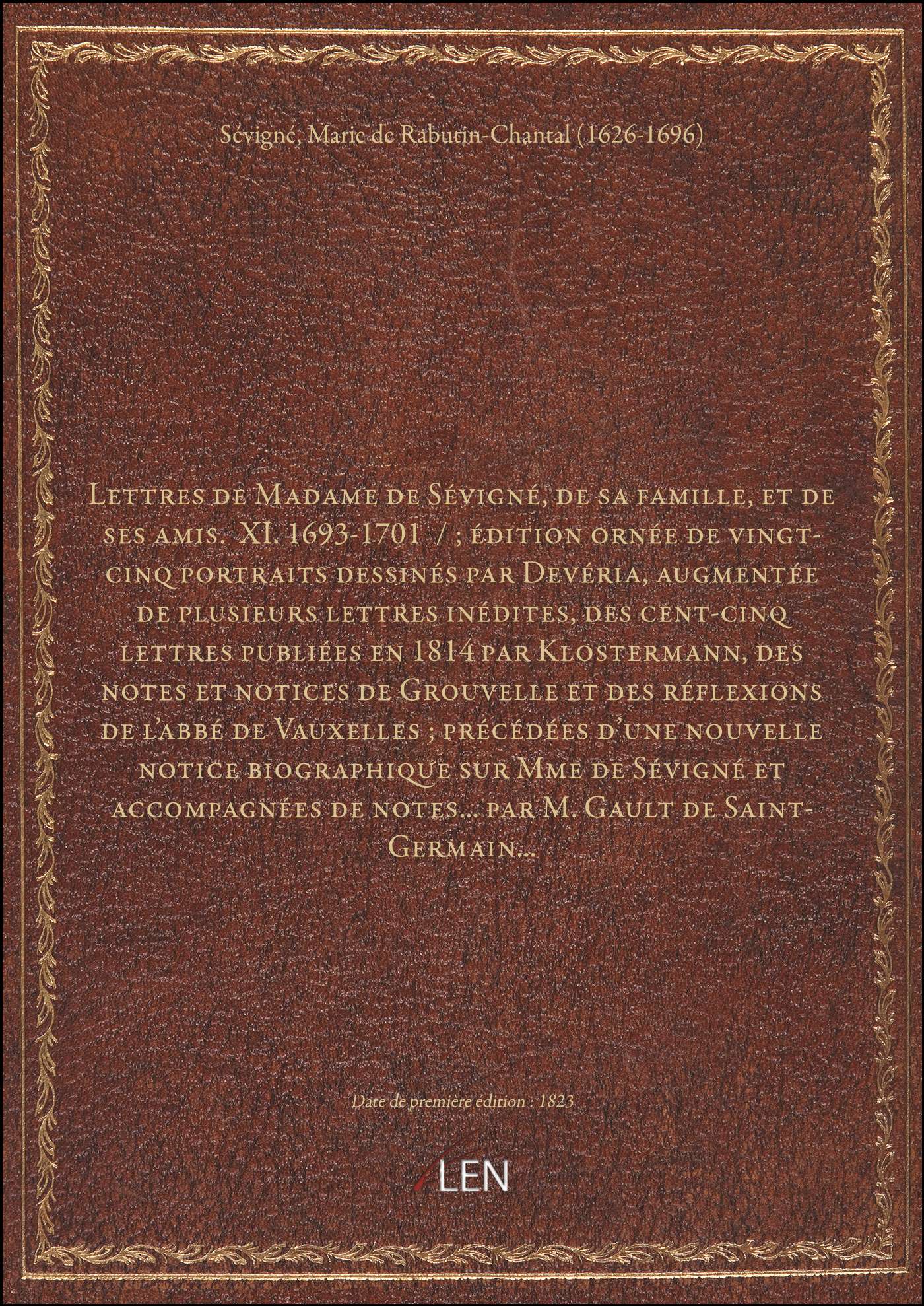 Titre complet : Lettres de Madame de Sévigné, de sa famille, et de ses amis. XI. 1693-1701 / ; édition ornée de vingt-cinq portraits dessinés par Devéria, augmentée de plusieurs lettres inédites, des cent-cinq lettres publiées en 1814 par Klostermann, des notes et notices de Grouvelle et des réflexions de l'abbé de Vauxelles ; précédées d'une nouvelle notice biographique sur Mme de Sévigné et accompagnées de notes... par M. Gault de Saint-Germain...