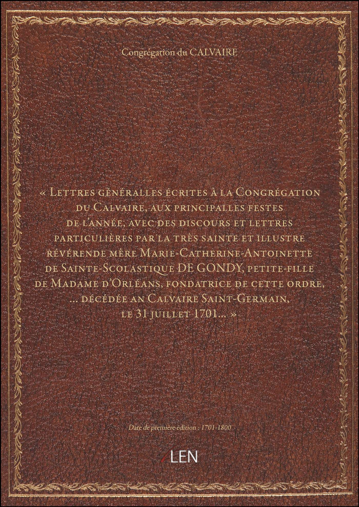 Titre complet : « Lettres généralles écrites à la Congrégation du Calvaire, aux principalles festes de l'année, avec des discours et lettres particulières par la très sainte et illustre révérende mère Marie-Catherine-Antoinette de Sainte-Scolastique DE GONDY, petite-fille de Madame d'Orléans, fondatrice de cette ordre,... décédée an Calvaire Saint-Germain, le 31 juillet 1701... »