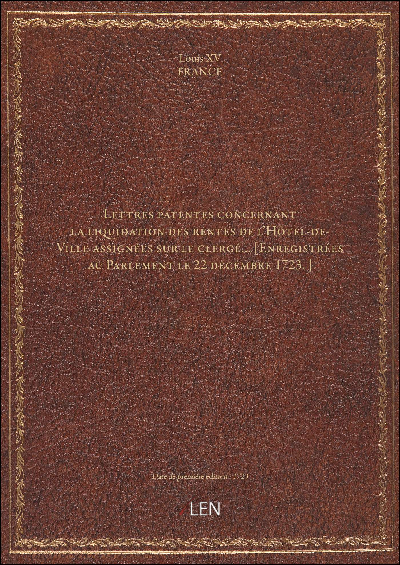 Titre complet : Lettres patentes concernant la liquidation des rentes de l'Hôtel-de-Ville assignées sur le clergé... [Enregistrées au Parlement le 22 décembre 1723.]