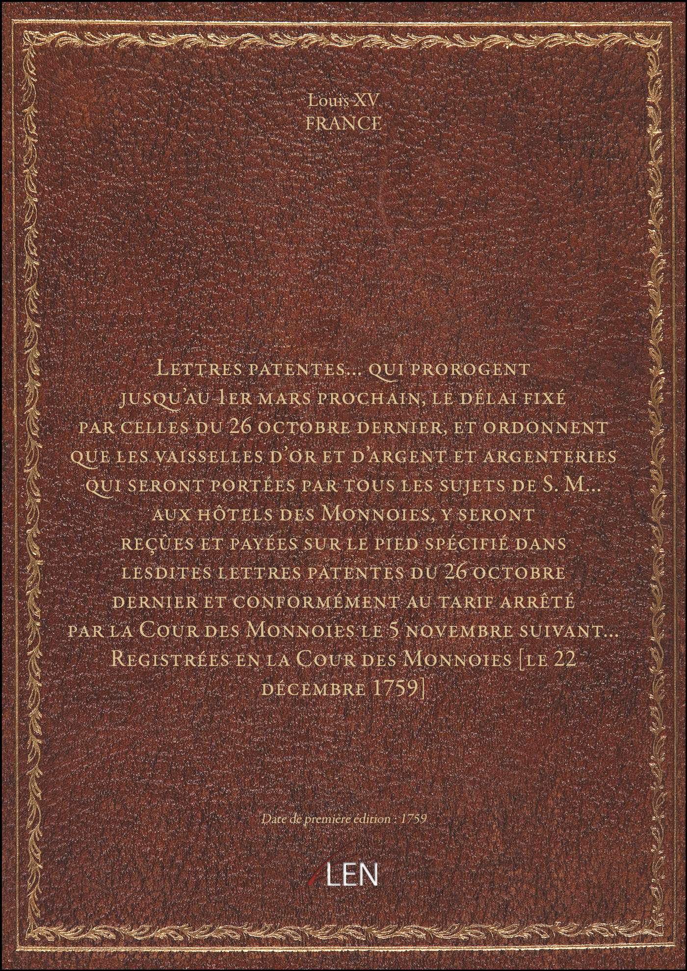Titre complet : Lettres patentes... qui prorogent jusqu'au 1er mars prochain, le délai fixé par celles du 26 octobre dernier, et ordonnent que les vaisselles d'or et d'argent et argenteries qui seront portées par tous les sujets de S. M... aux hôtels des Monnoies, y seront reçûes et payées sur le pied spécifié dans lesdites lettres patentes du 26 octobre dernier et conformément au tarif arrêté par la Cour des Monnoies le 5 novembre suivant... Registrées en la Cour des Monnoies [le 22 décembre 1759]