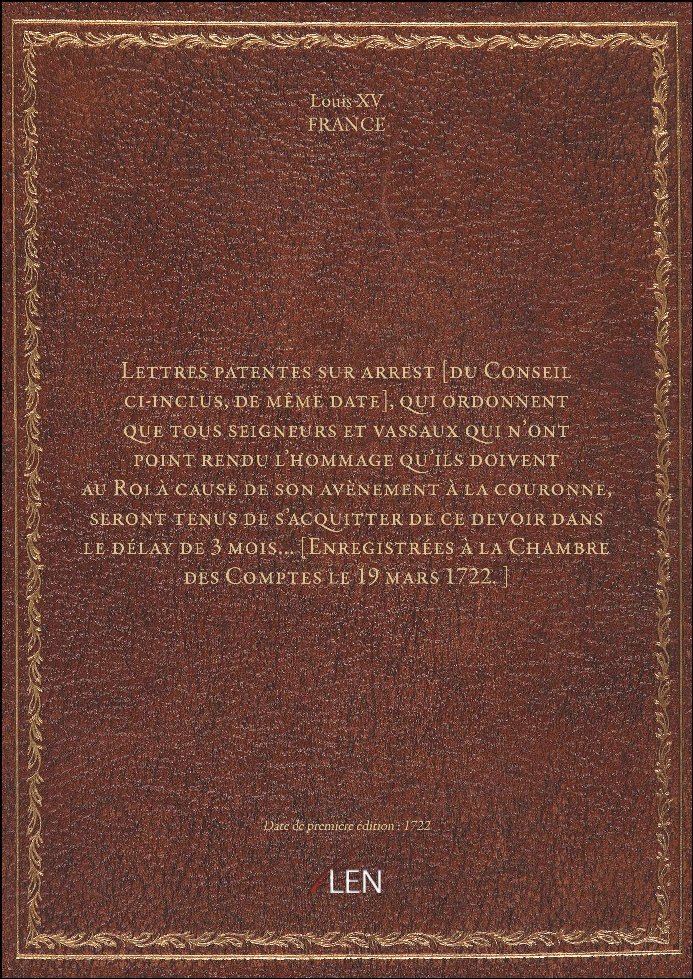 Titre complet : Lettres patentes sur arrest [du Conseil ci-inclus, de même date], qui ordonnent que tous seigneurs et vassaux qui n'ont point rendu l'hommage qu'ils doivent au Roi à cause de son avènement à la couronne, seront tenus de s'acquitter de ce devoir dans le délay de 3 mois... [Enregistrées à la Chambre des Comptes le 19 mars 1722.]