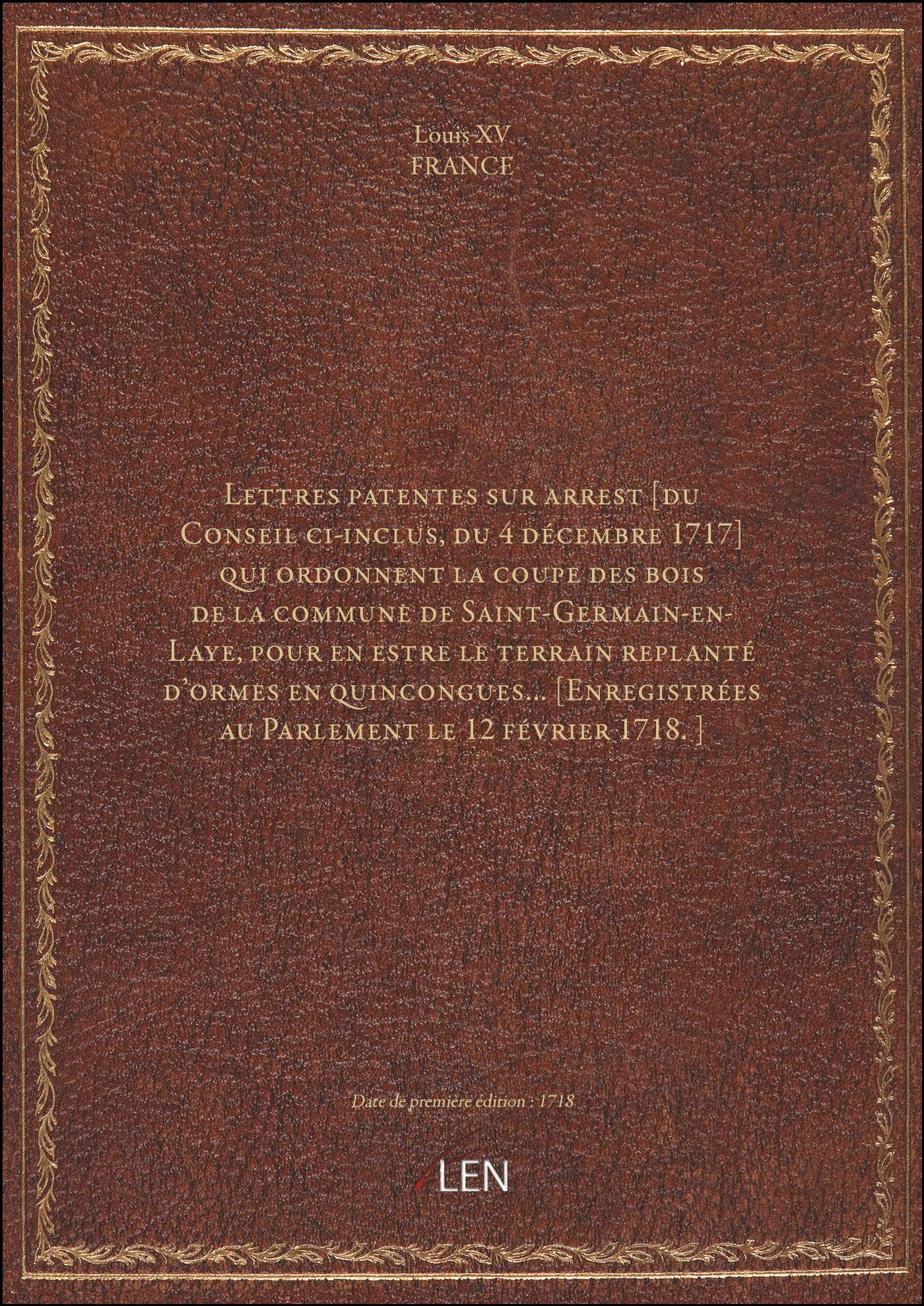 Titre complet : Lettres patentes sur arrest [du Conseil ci-inclus, du 4 décembre 1717] qui ordonnent la coupe des bois de la commune de Saint-Germain-en-Laye, pour en estre le terrain replanté d'ormes en quincongues... [Enregistrées au Parlement le 12 février 1718.]