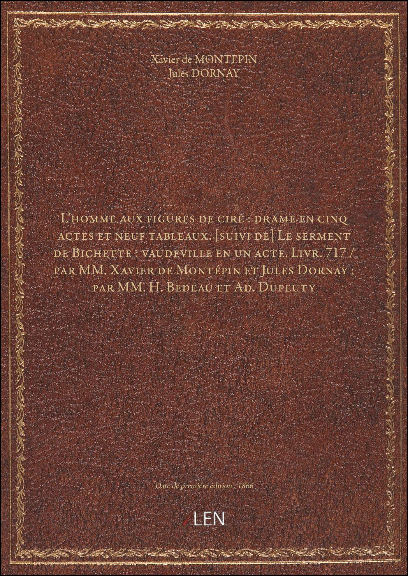 L'homme aux figures de cire : drame en cinq actes et neuf tableaux. [suivi de] Le serment de Bichette : vaudeville en un acte. Livr. 717 / par MM. Xavier de Montépin et Jules Dornay ; par MM. H. Bedeau et Ad. Dupeuty