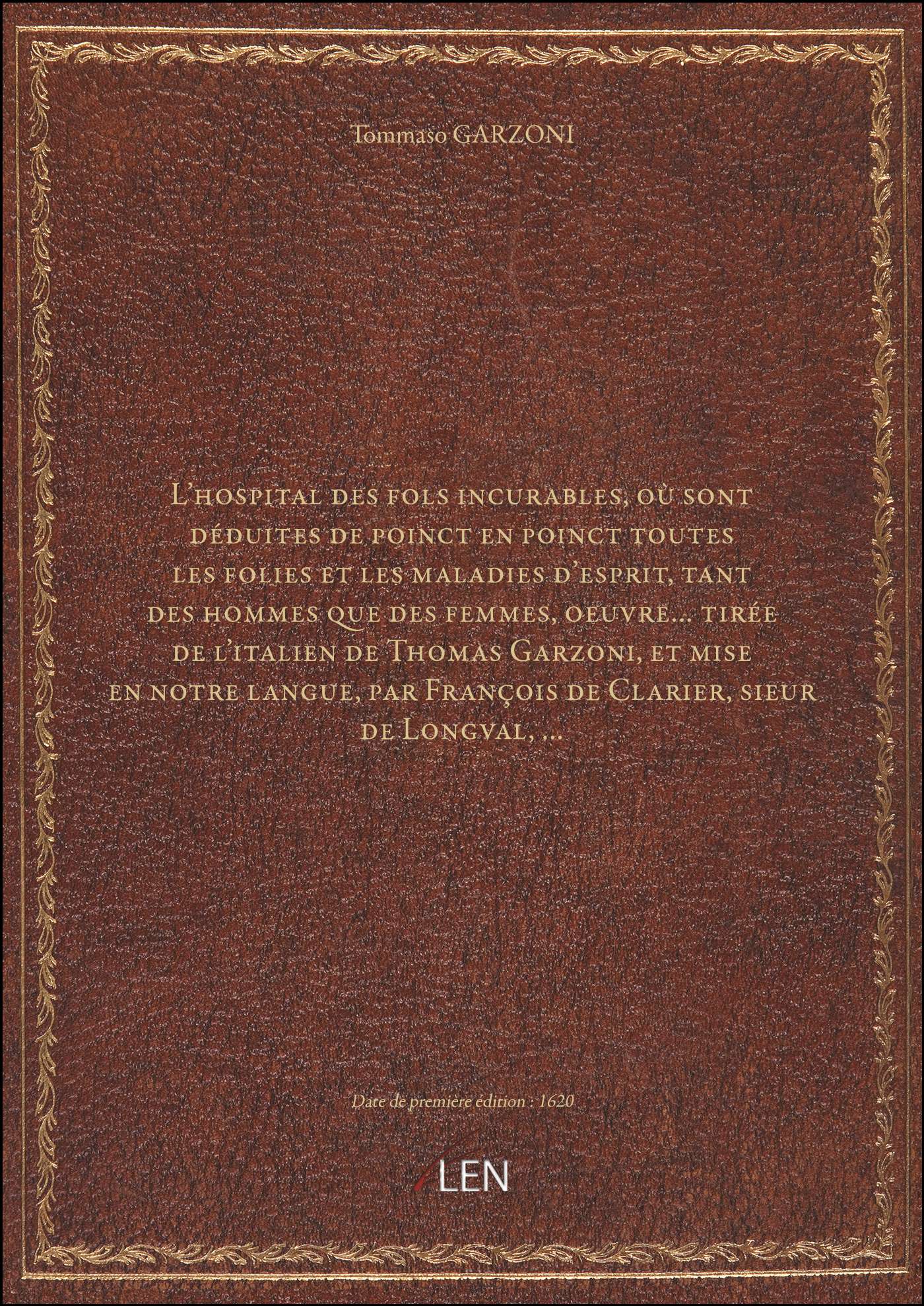 Titre complet : L'hospital des fols incurables , où sont déduites de poinct en poinct toutes les folies et les maladies d'esprit, tant des hommes que des femmes, oeuvre... tirée de l'italien de Thomas Garzoni, et mise en notre langue, par François de Clarier, sieur de Longval,...