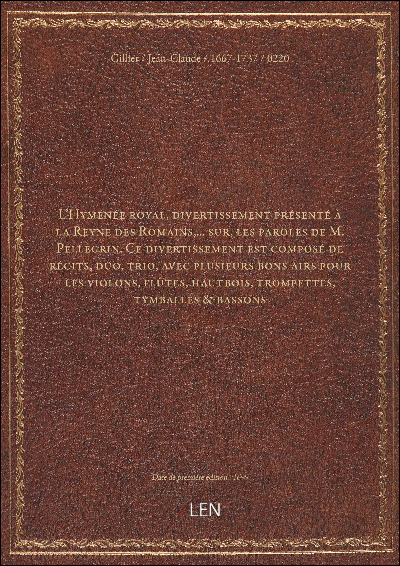 Titre complet : L'Hyménée royal, divertissement présenté à la Reyne des Romains,... sur, les paroles de M. Pellegrin. Ce divertissement est composé de récits, duo, trio, avec plusieurs bons airs pour les violons, flûtes, hautbois, trompettes, tymballes & bassons
