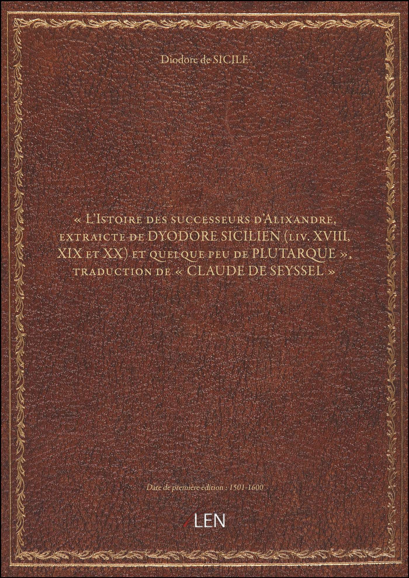 Titre complet : « L'Istoire des successeurs d'Alixandre, extraicte de DYODORE SICILIEN (liv. XVIII, XIX et XX) et quelque peu de PLUTARQUE », traduction de « CLAUDE DE SEYSSEL »
