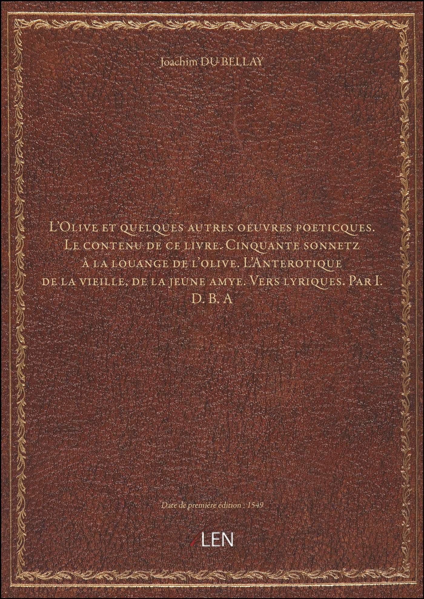 Titre complet : L'Olive et quelques autres oeuvres poeticques. Le contenu de ce livre. Cinquante sonnetz à la louange de l'olive. L'Anterotique de la vieille, de la jeune amye. Vers lyriques. Par I.D.B.A