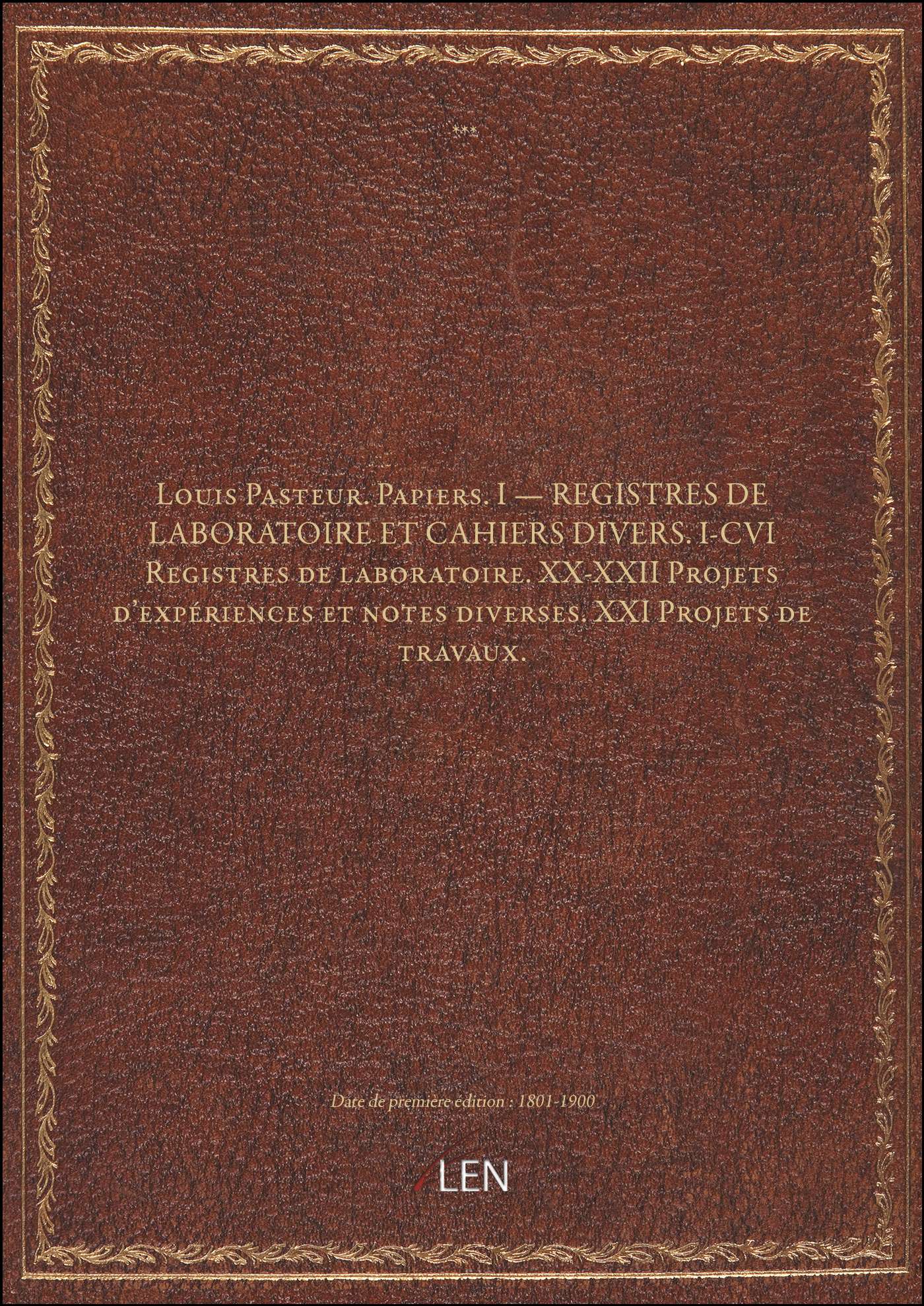Titre complet : Louis Pasteur. Papiers. I — REGISTRES DE LABORATOIRE ET CAHIERS DIVERS. I-CVI Registres de laboratoire. XX-XXII Projets d'expériences et notes diverses. XXI Projets de travaux.