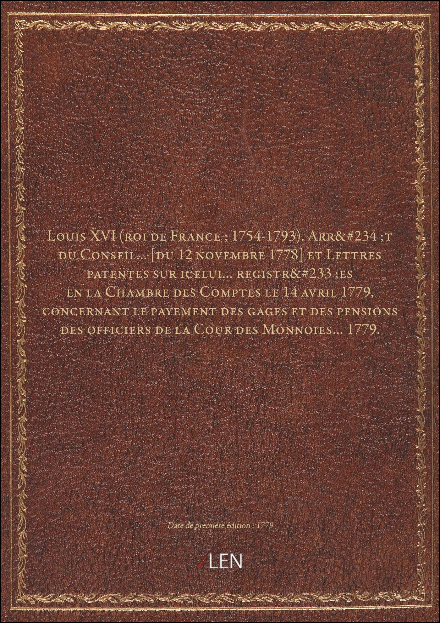 Titre complet : Louis XVI (roi de France ; 1754-1793). Arrêt du Conseil... [du 12 novembre 1778] et Lettres patentes sur icelui... registrées en la Chambre des Comptes le 14 avril 1779, concernant le payement des gages et des pensions des officiers de la Cour des Monnoies.... 1779.