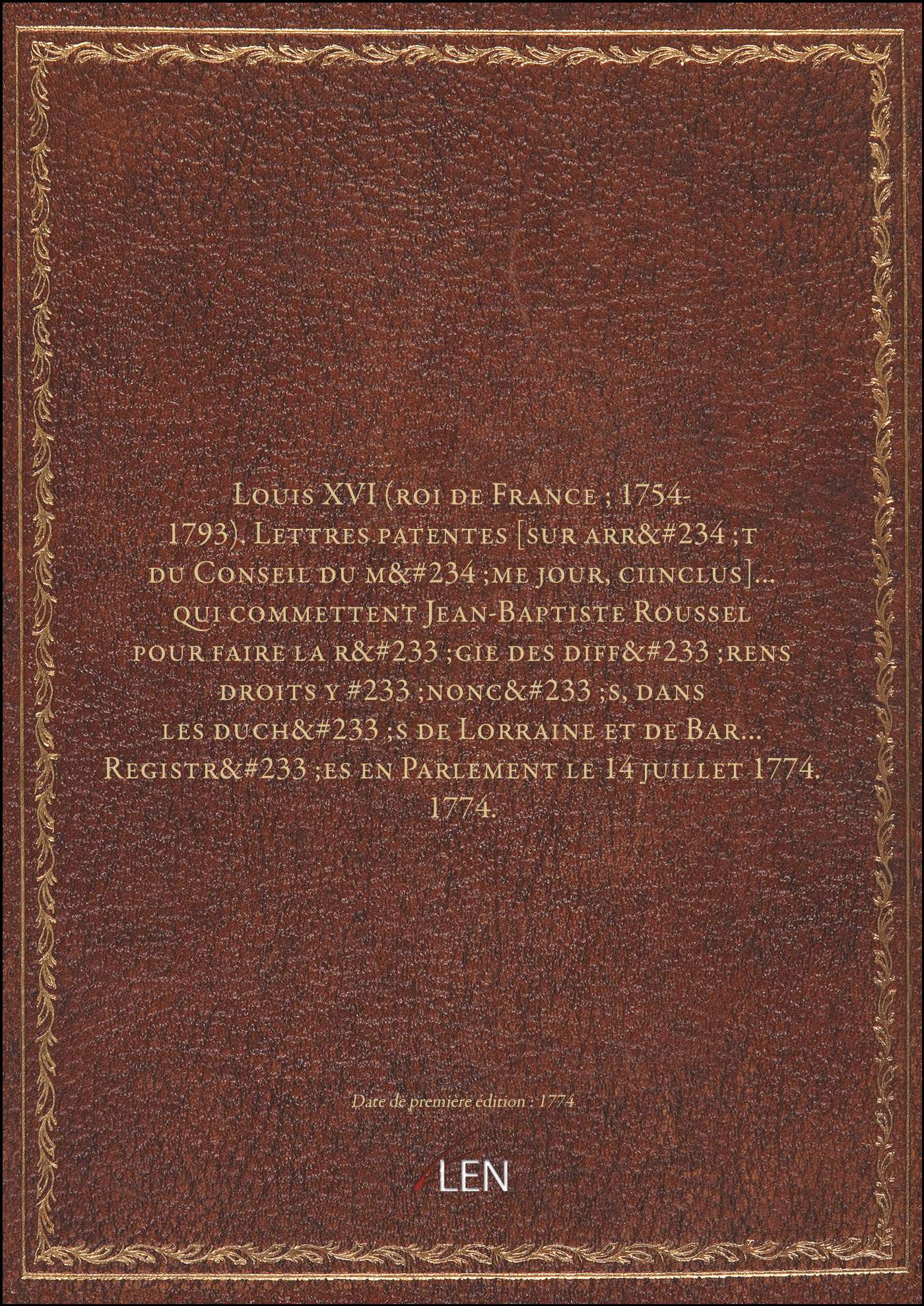 Titre complet : Louis XVI (roi de France ; 1754-1793). Lettres patentes [sur arrêt du Conseil du même jour, ciinclus]... qui commettent Jean-Baptiste Roussel pour faire la régie des différens droits y Enoncés, dans les duchés de Lorraine et de Bar... Registrées en Parlement le 14 juillet 1774. 1774.