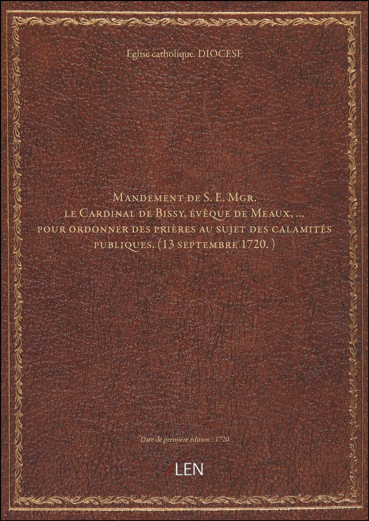 Titre complet : Mandement de S. E. Mgr. le Cardinal de Bissy, évêque de Meaux,... pour ordonner des prières au sujet des calamités publiques. (13 septembre 1720.)