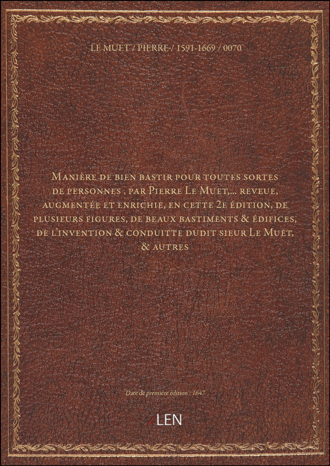 Titre complet : Manière de bien bastir pour toutes sortes de personnes , par Pierre Le Muet,... reveue, augmentée et enrichie, en cette 2e édition, de plusieurs figures, de beaux bastiments & édifices, de l'invention & conduitte dudit sieur Le Muet, & autres