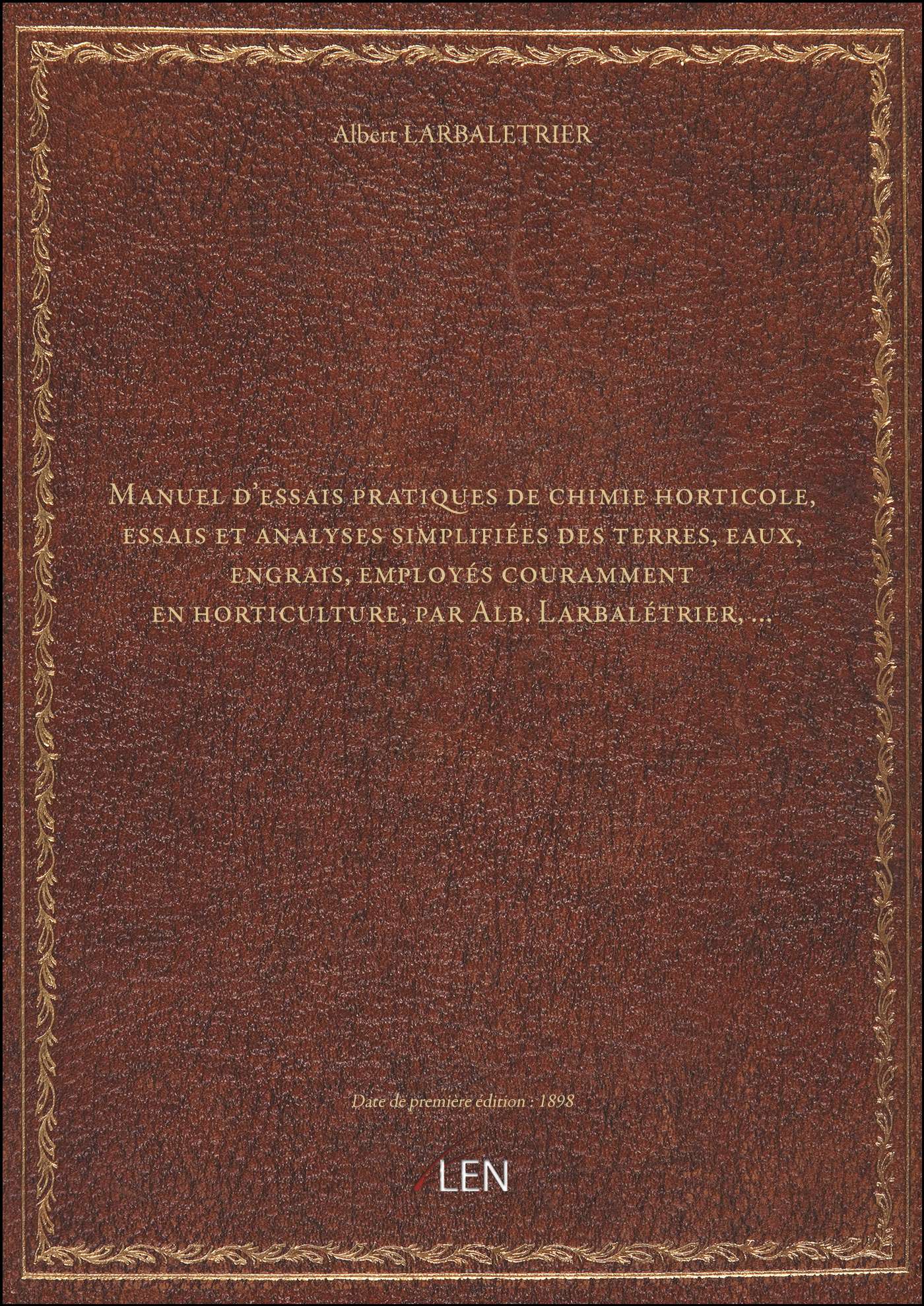 Titre complet : Manuel d'essais pratiques de chimie horticole, essais et analyses simplifiées des terres, eaux, engrais, employés couramment en horticulture, par Alb. Larbalétrier,...