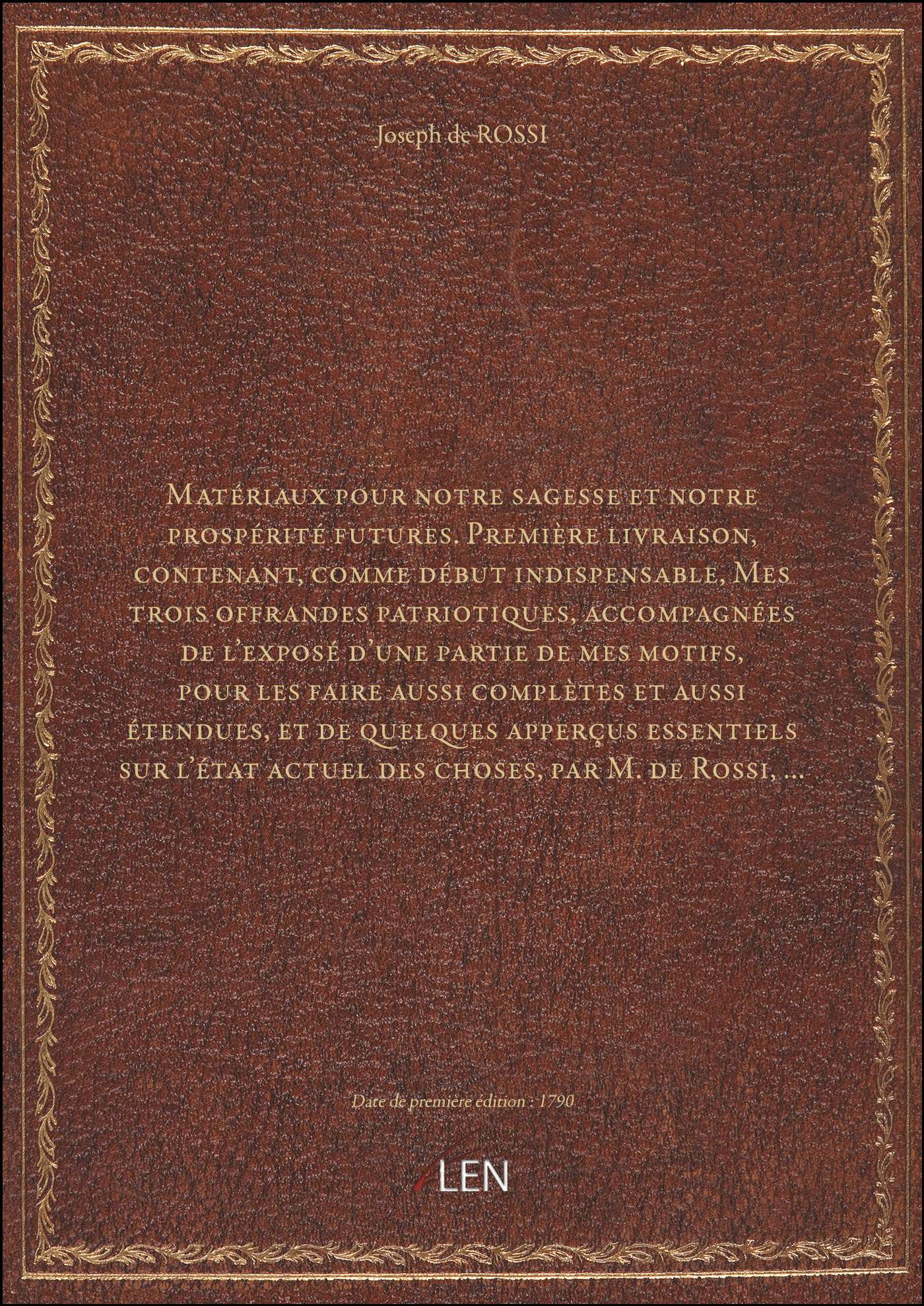 Titre complet : Matériaux pour notre sagesse et notre prospérité futures . Première livraison, contenant, comme début indispensable, Mes trois offrandes patriotiques, accompagnées de l'exposé d'une partie de mes motifs, pour les faire aussi complètes et aussi étendues, et de quelques apperçus essentiels sur l'état actuel des choses, par M. de Rossi,...