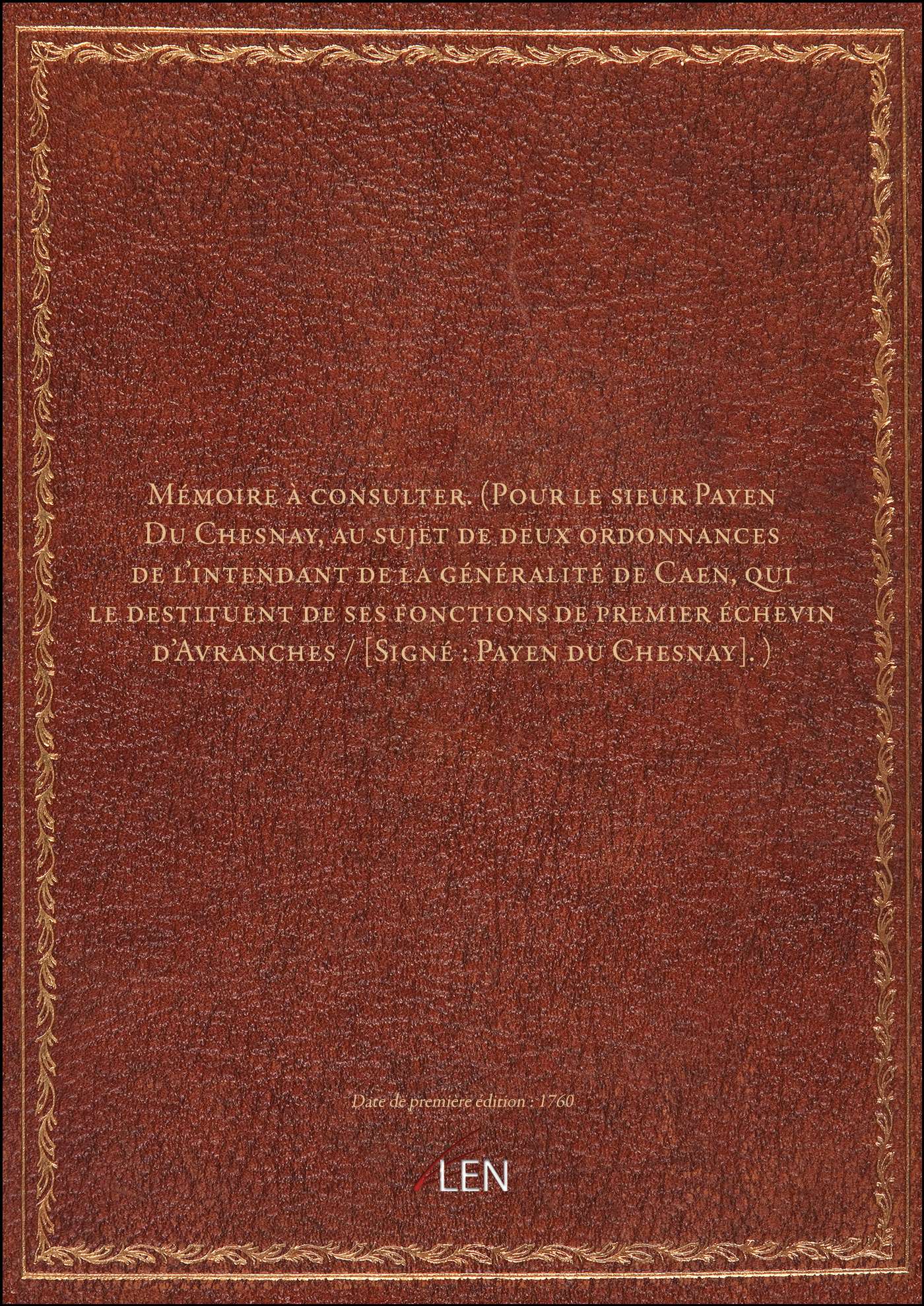 Titre complet : Mémoire à consulter. (Pour le sieur Payen Du Chesnay, au sujet de deux ordonnances de l'intendant de la généralité de Caen, qui le destituent de ses fonctions de premier échevin d'Avranches / [Signé : Payen du Chesnay].)
