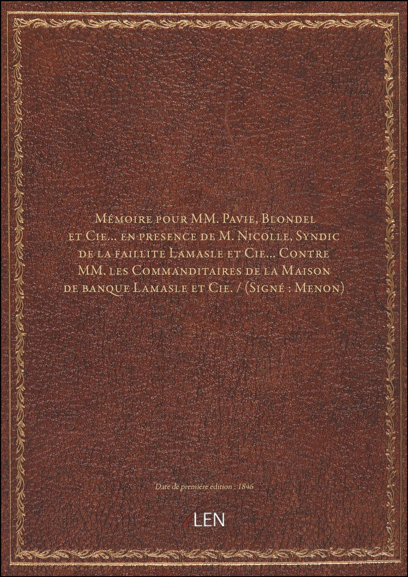 Titre complet : Mémoire pour MM. Pavie, Blondel et Cie... en presence de M. Nicolle, Syndic de la faillite Lamasle et Cie... Contre MM. les Commanditaires de la Maison de banque Lamasle et Cie. / (Signé : Menon)