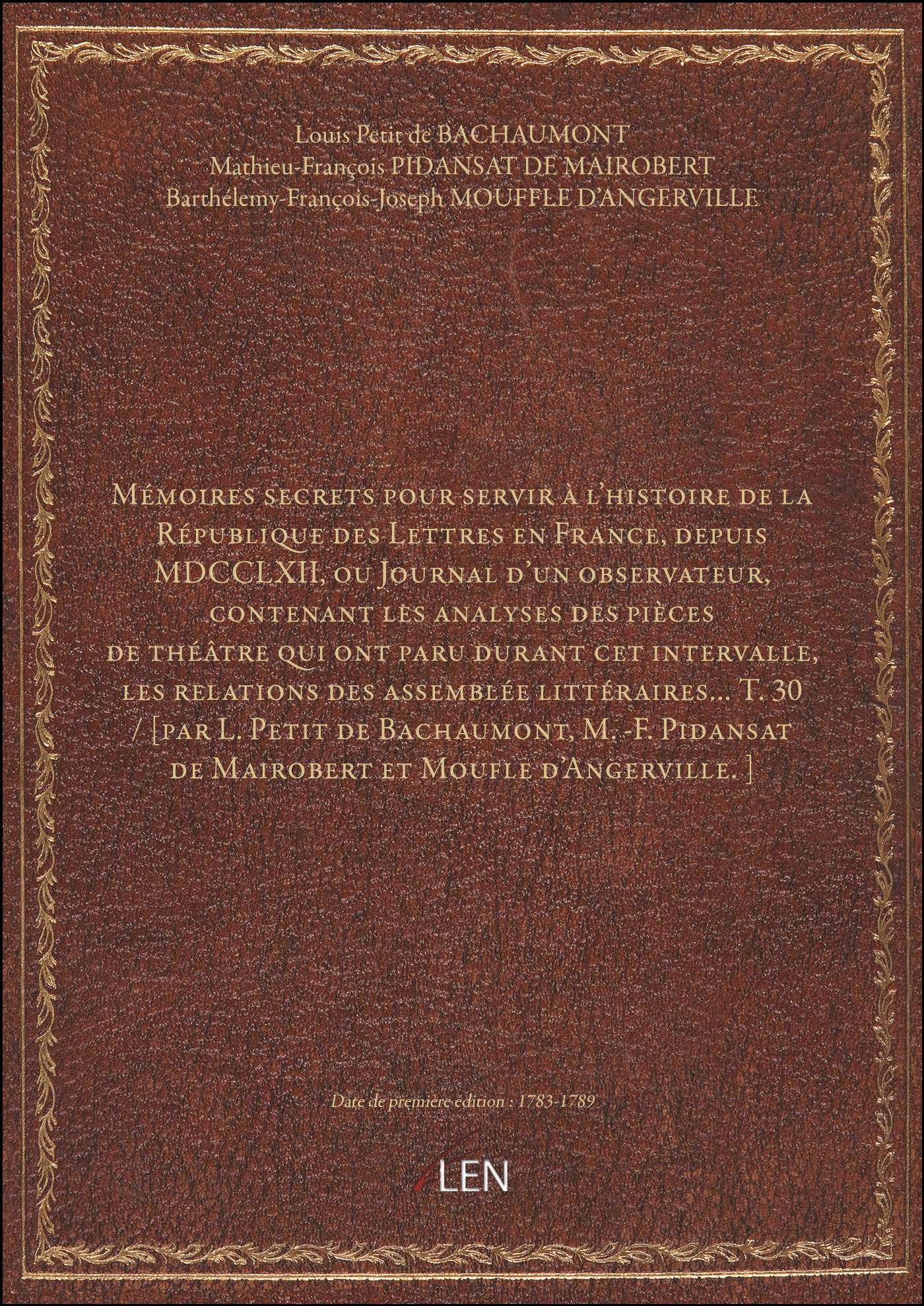 Titre complet : Mémoires secrets pour servir à l'histoire de la République des Lettres en France, depuis MDCCLXII, ou Journal d'un observateur, contenant les analyses des pièces de théâtre qui ont paru durant cet intervalle, les relations des assemblée littéraires.... T. 30 / [par L. Petit de Bachaumont, M.-F. Pidansat de Mairobert et Moufle d'Angerville.]