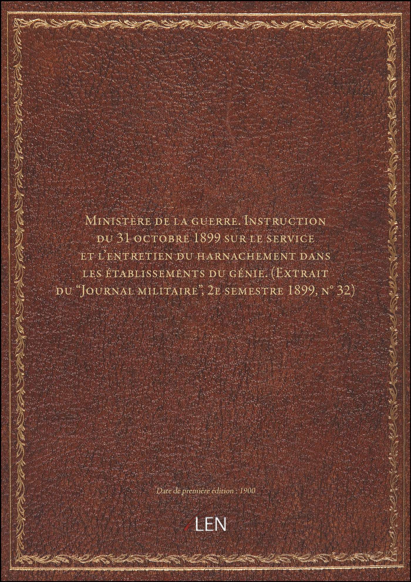 Titre complet : Ministère de la guerre. Instruction du 31 octobre 1899 sur le service et l'entretien du harnachement dans les établissements du génie. (Extrait du "Journal militaire", 2e semestre 1899, n° 32)