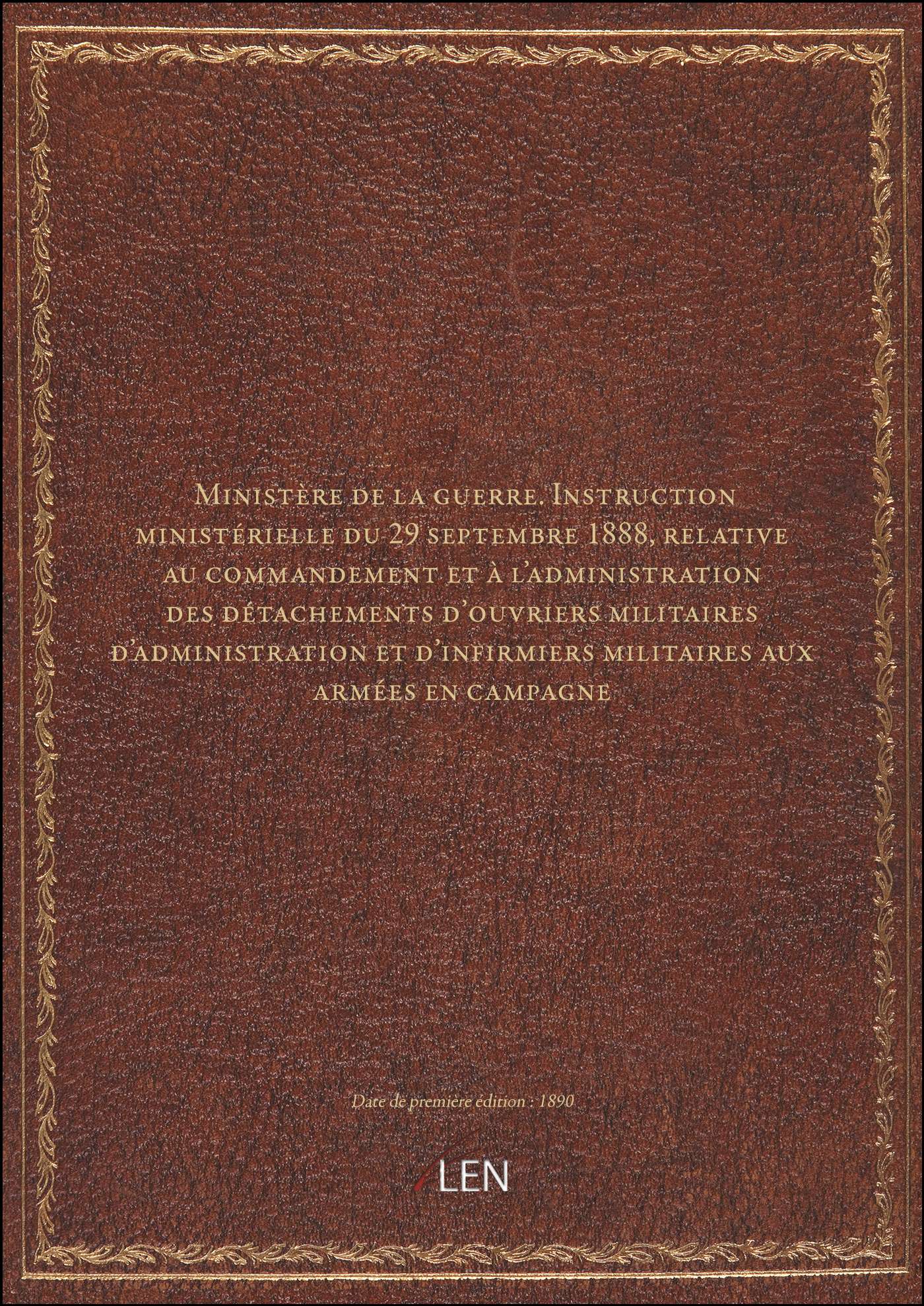 Titre complet : Ministère de la guerre. Instruction ministérielle du 29 septembre 1888, relative au commandement et à l'administration des détachements d'ouvriers militaires d'administration et d'infirmiers militaires aux armées en campagne
