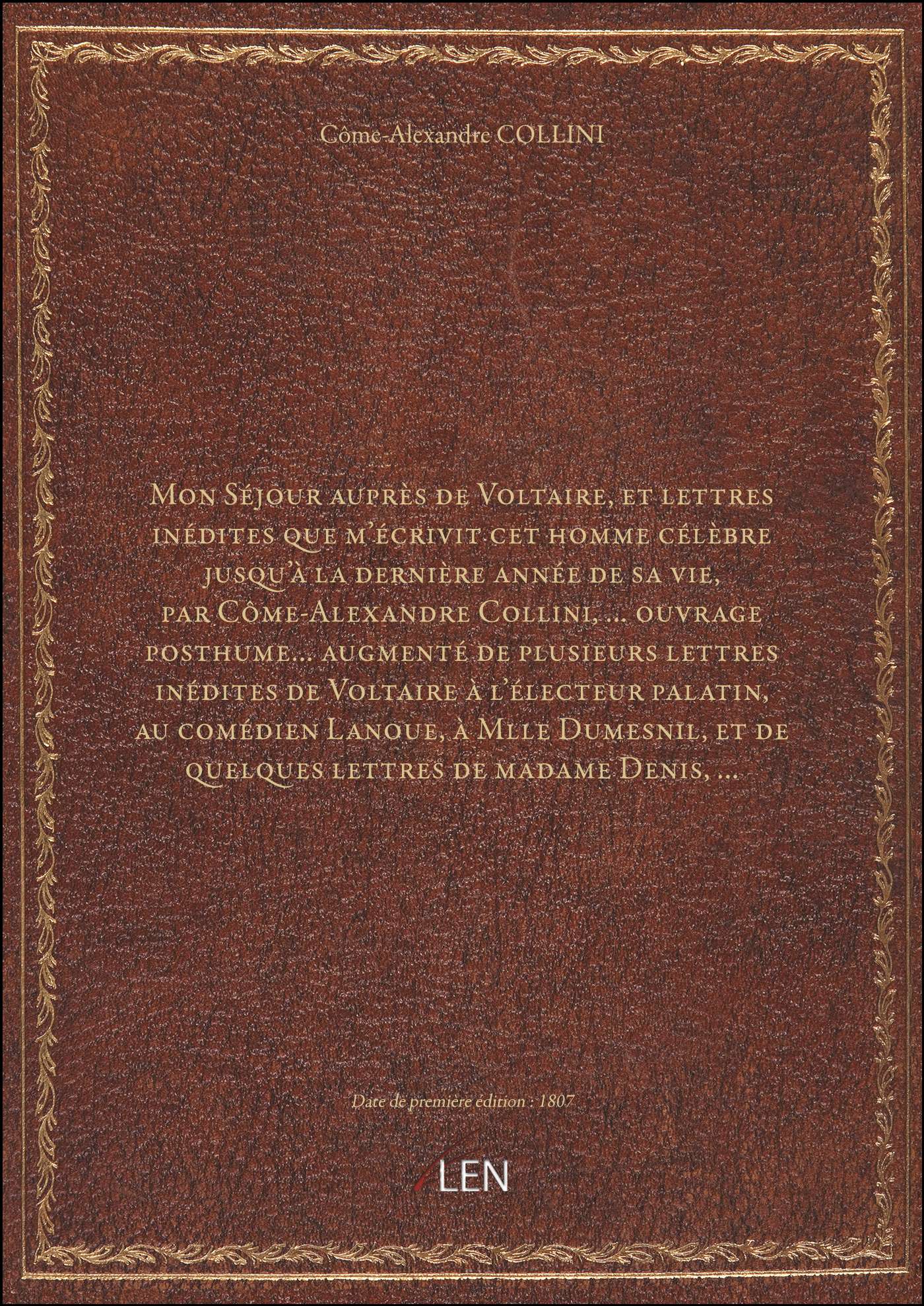 Titre complet : Mon Séjour auprès de Voltaire, et lettres inédites que m'écrivit cet homme célèbre jusqu'à la dernière année de sa vie, par Côme-Alexandre Collini,... ouvrage posthume... augmenté de plusieurs lettres inédites de Voltaire à l'électeur palatin, au comédien Lanoue, à Mlle Dumesnil, et de quelques lettres de madame Denis,...