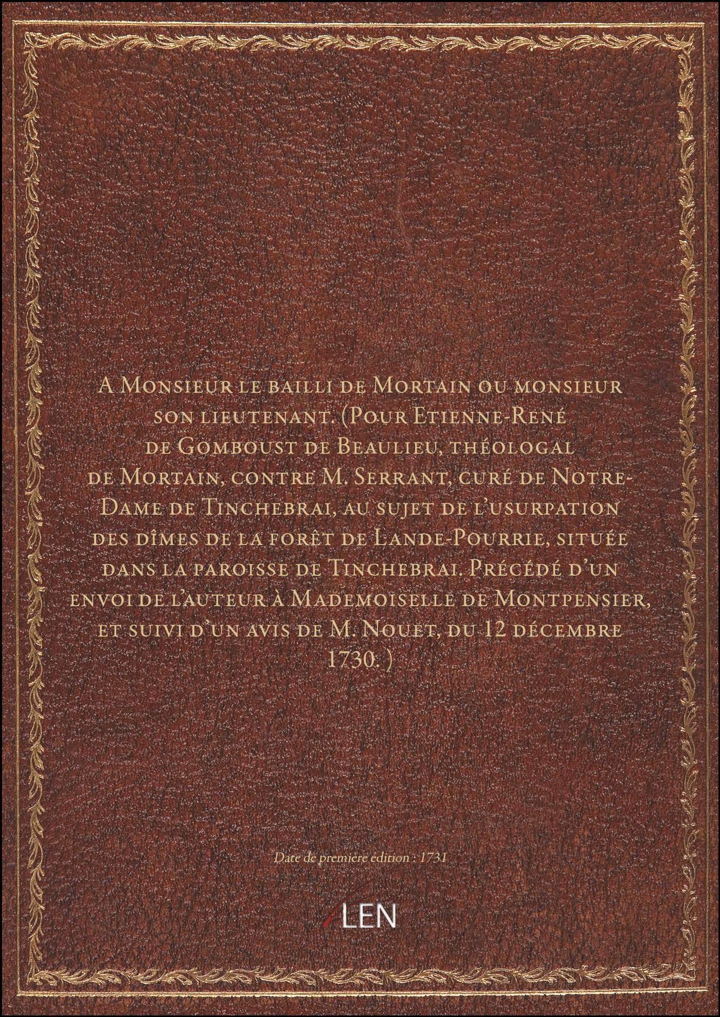 Titre complet : A Monsieur le bailli de Mortain ou monsieur son lieutenant. (Pour Etienne-René de Gomboust de Beaulieu, théologal de Mortain, contre M. Serrant, curé de Notre-Dame de Tinchebrai, au sujet de l'usurpation des dîmes de la forêt de Lande-Pourrie, située dans la paroisse de Tinchebrai. Précédé d'un envoi de l'auteur à Mademoiselle de Montpensier, et suivi d'un avis de M. Nouet, du 12 décembre 1730.)