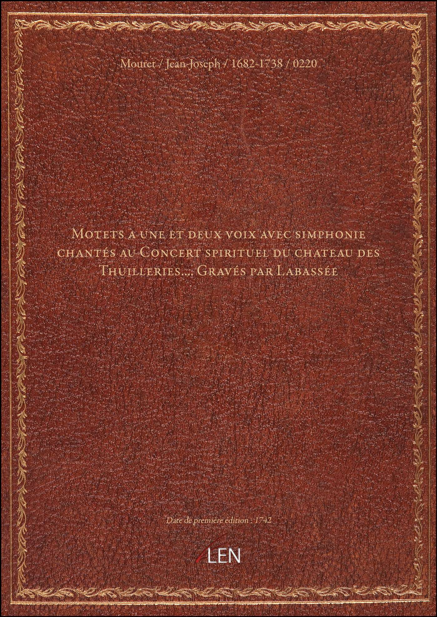 Titre complet : Motets a une et deux voix avec simphonie chantés au Concert spirituel du chateau des Thuilleries.... Gravés par Labassée