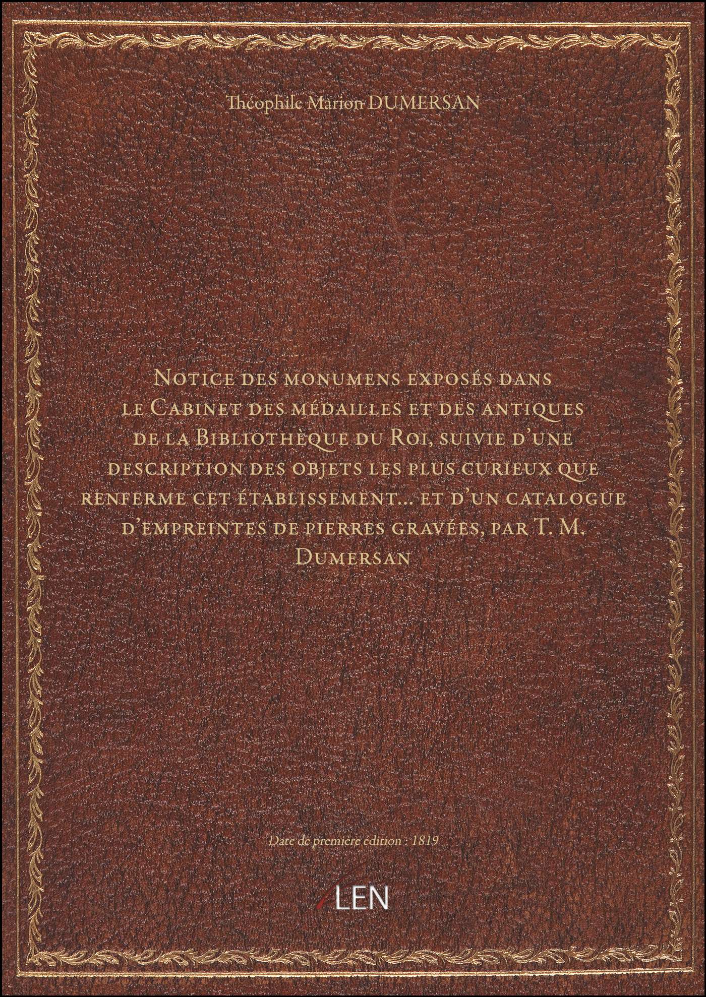 Titre complet : Notice des monumens exposés dans le Cabinet des médailles et des antiques de la Bibliothèque du Roi , suivie d'une description des objets les plus curieux que renferme cet établissement... et d'un catalogue d'empreintes de pierres gravées, par T. M. Dumersan