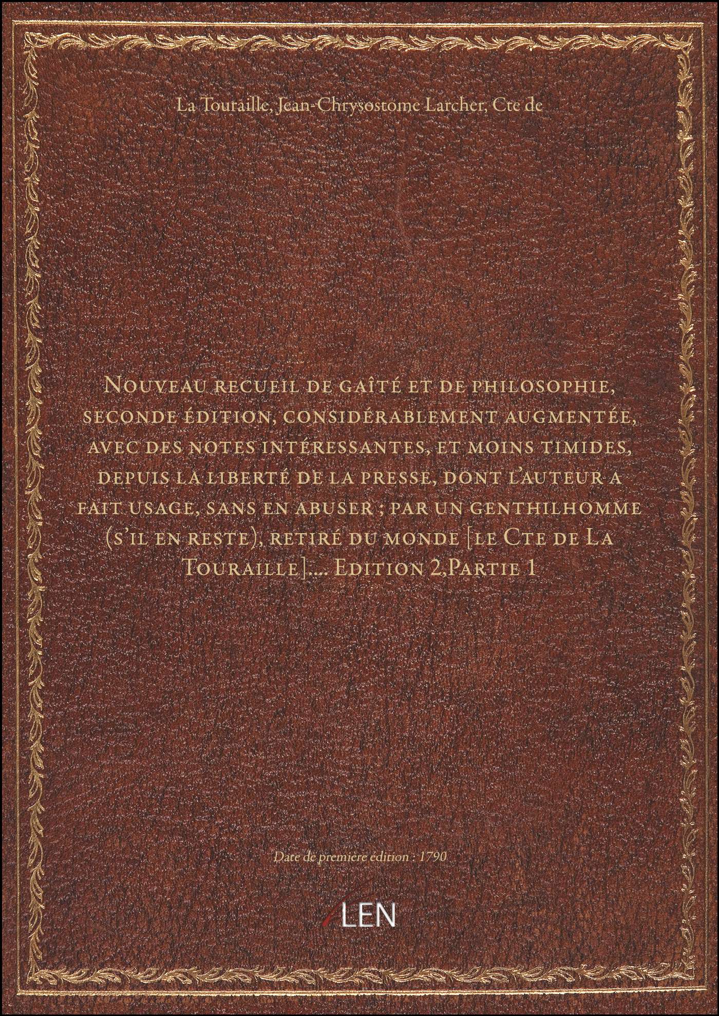 Titre complet : Nouveau recueil de gaîté et de philosophie, seconde édition, considérablement augmentée, avec des notes intéressantes, et moins timides, depuis la liberté de la presse, dont l'auteur a fait usage, sans en abuser ; par un genthilhomme (s'il en reste), retiré du monde [le Cte de La Touraille].... Edition 2,Partie 1