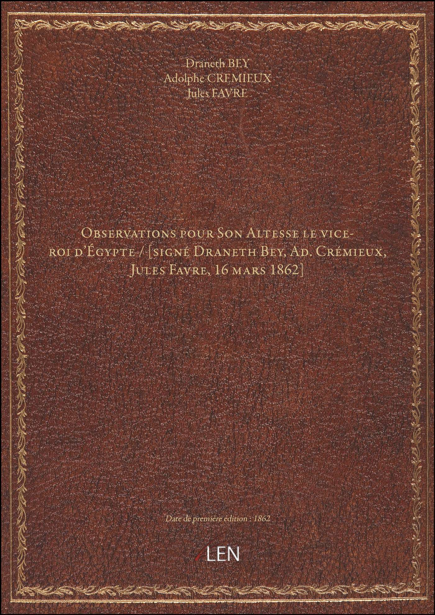 Titre complet : Observations pour Son Altesse le vice-roi d'Égypte / [signé Draneth Bey, Ad. Crémieux, Jules Favre, 16 mars 1862]