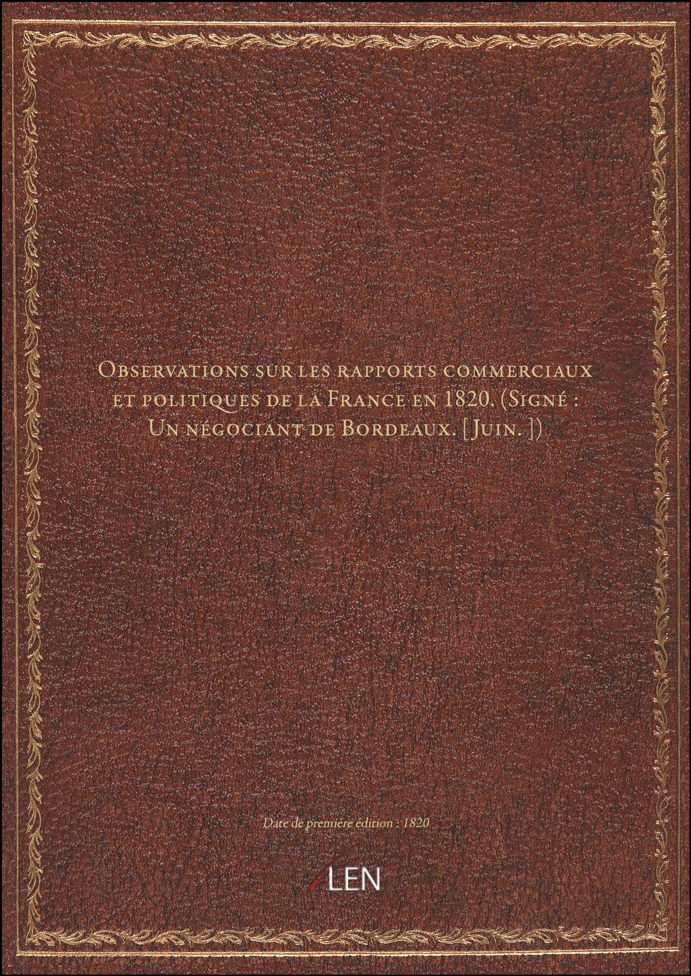 Titre complet : Observations sur les rapports commerciaux et politiques de la France en 1820. (Signé : Un négociant de Bordeaux. [Juin.])