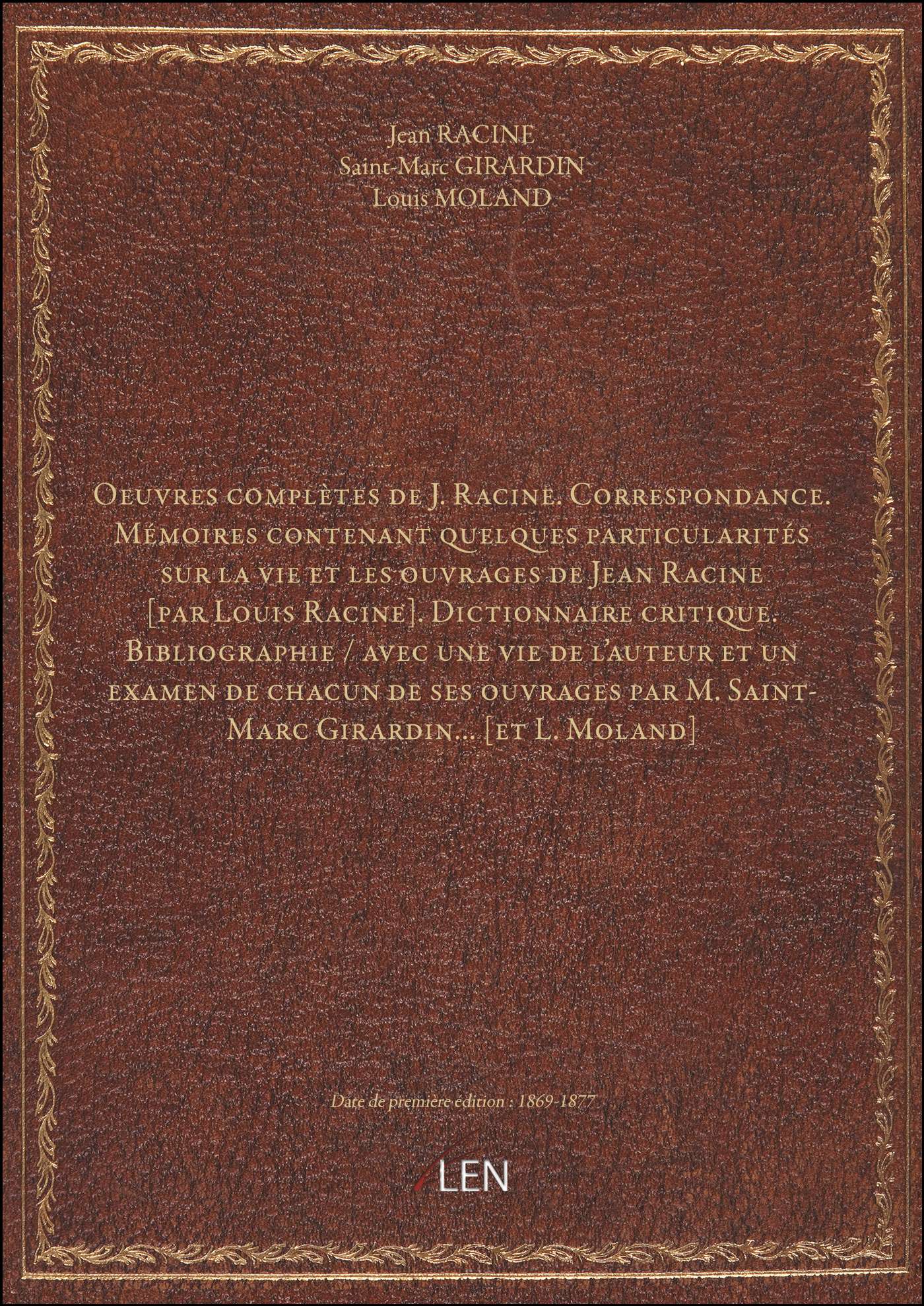 Titre complet : Oeuvres complètes de J. Racine. Correspondance. Mémoires contenant quelques particularités sur la vie et les ouvrages de Jean Racine [par Louis Racine]. Dictionnaire critique. Bibliographie / avec une vie de l'auteur et un examen de chacun de ses ouvrages par M. Saint-Marc Girardin... [et L. Moland]